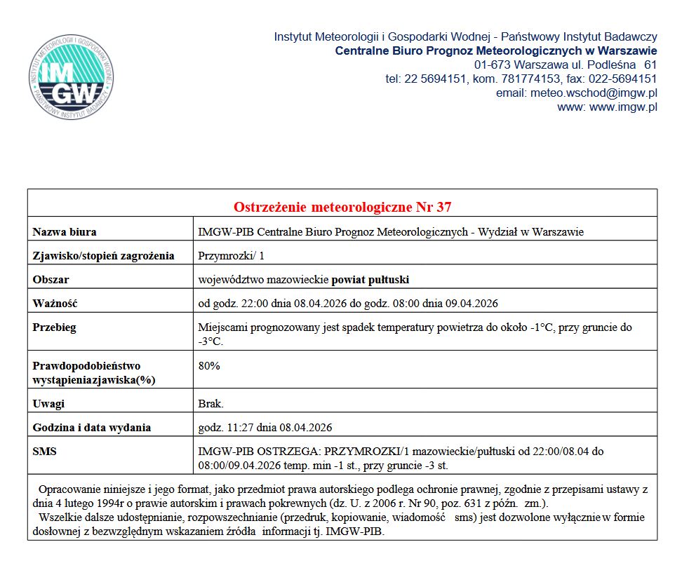 W związku z ostrzeżeniem wydanym przez Instytut Meteorologii i Gospodarki Wodnejw Warszawie informujemy, że od godz. 20:00 dnia 08.04.2026 r....