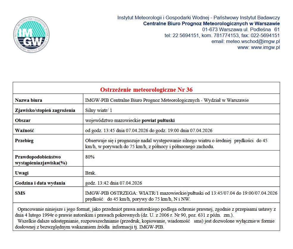 W związku z ostrzeżeniem wydanym przez Instytut Meteorologii i Gospodarki Wodnejw Warszawie informujemy, że od godz. 13:45 dnia 07.04.2026 r....