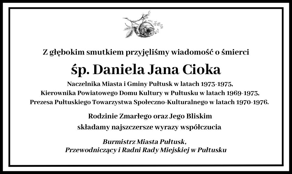Z głębokim smutkiem przyjęliśmy wiadomość o śmierci śp. Daniela Jana Cioka Naczelnika Miasta i Gminy Pułtusk w latach 1973-1975,Kierownika Powiatowego...