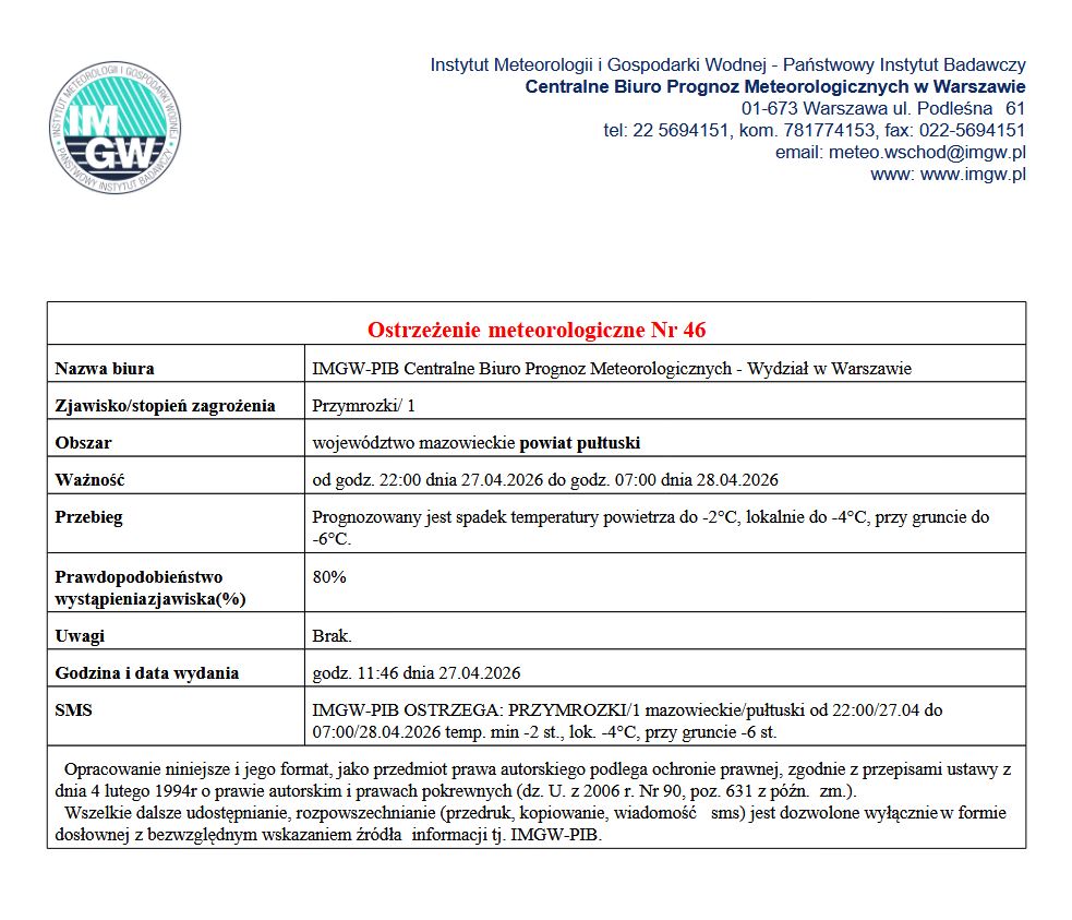 W związku z ostrzeżeniem wydanym przez Instytut Meteorologii i Gospodarki Wodnejw Warszawie informujemy, że od godz. 22:00 dnia 27.04.2026 r....