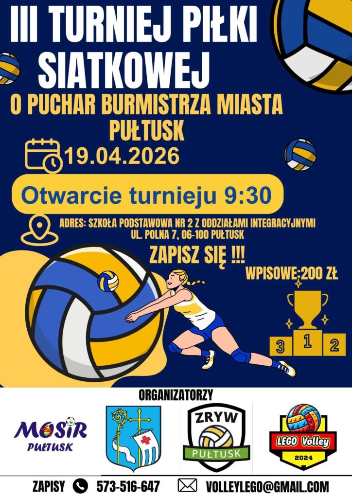 Już 19 kwietnia 2026 r. w Pułtusku odbędzie się III Turniej Piłki Siatkowej o Puchar Burmistrza. Zawody rozegrane zostaną w Szkole Podstawowej nr 2 z Oddziałami Integracyjnymi przy ul. Polnej 7, a ich otwarcie zaplanowano na godzinę 9:30.