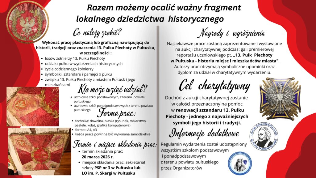 Najciekawsze i najbardziej poruszające prace zostaną nagrodzone oraz wystawione na aukcji, z której dochód zostanie przeznaczony na pomoc w odnowieniu odnalezionego sztandaru 13 Pułku Piechoty.