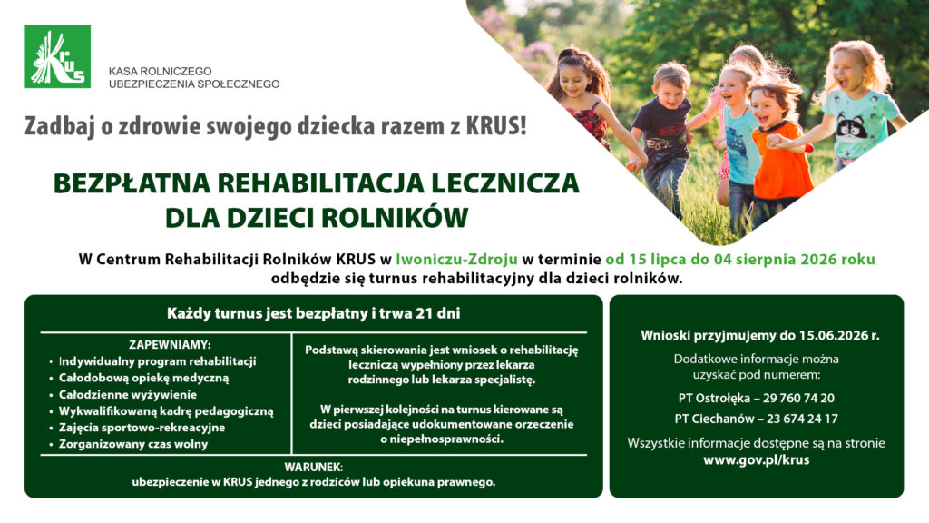 Kasa Rolniczego Ubezpieczenia Społecznego informuje o turnusach rehabilitacyjnych dla dzieci rolników.