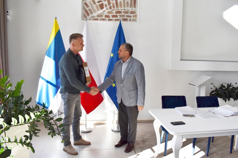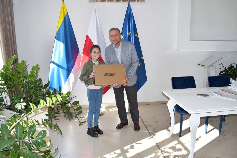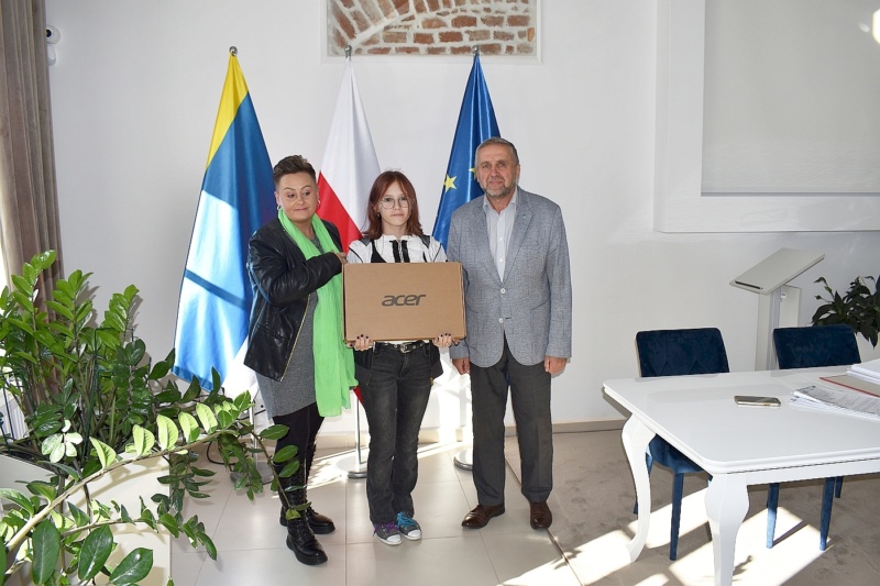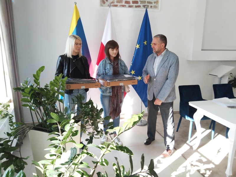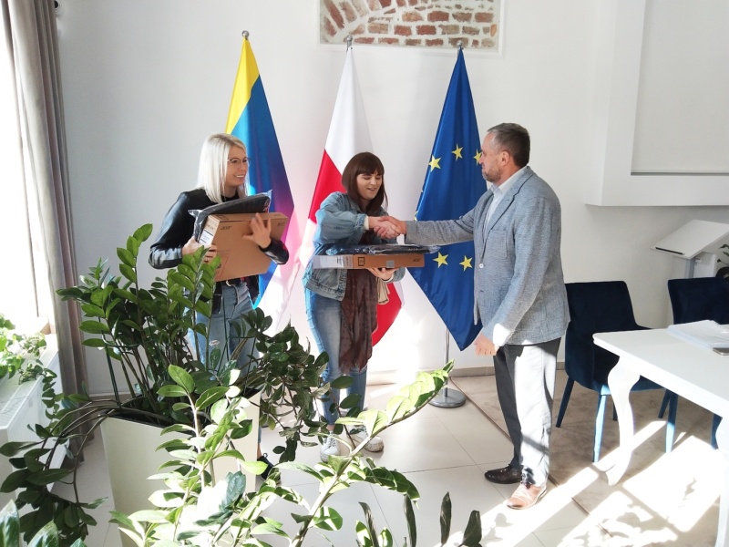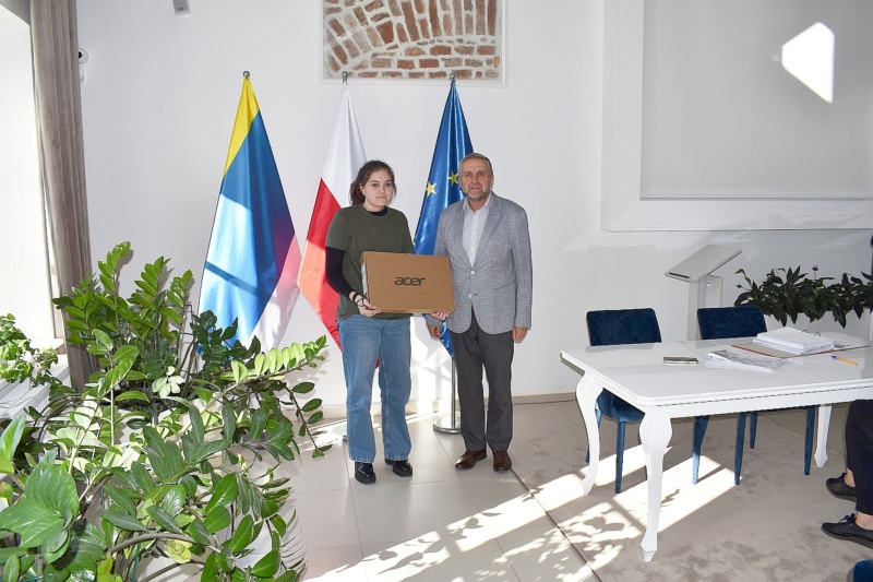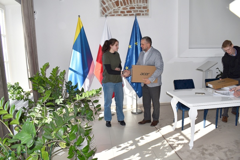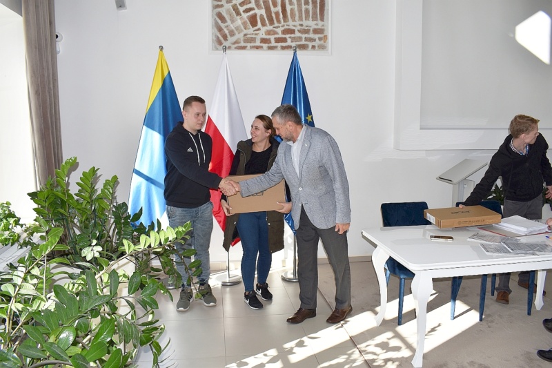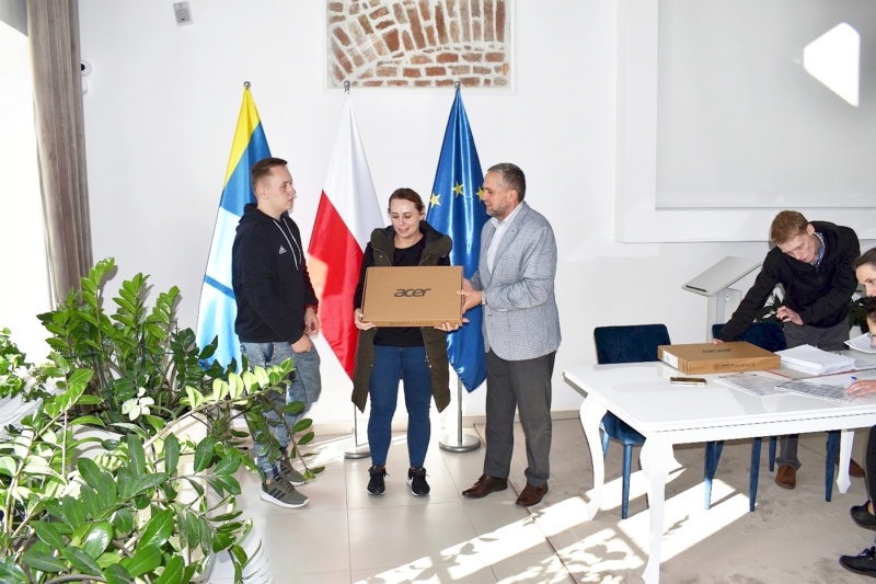 Burmistrz Wojciech Gregorczyk wręczył sprzęt komputerowy pierwszym uczniom – dzieciom i wnukom byłych pracowników PGR-ów