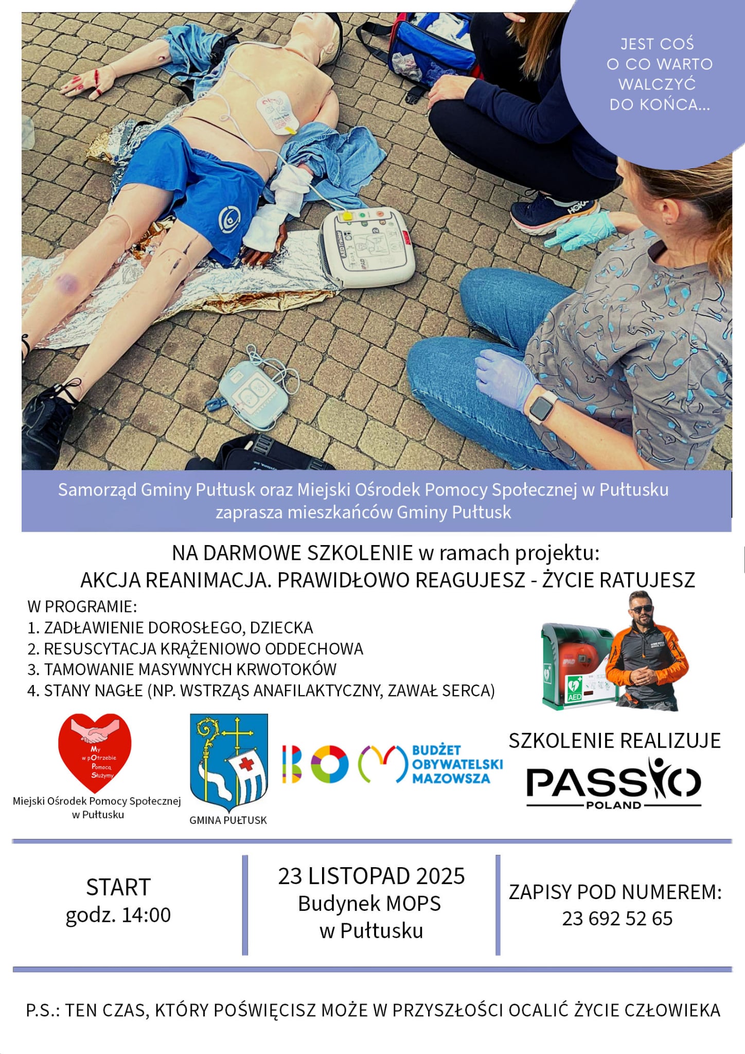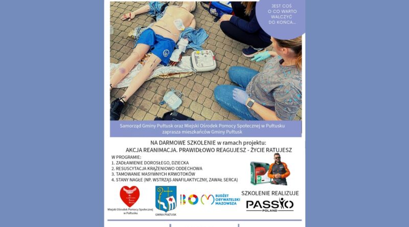 Szkolenie, adresowane do wszystkich chętnych mieszkańców Gminy Pułtusk, odbędzie się w ramach projektu „AKCJA REANIMACJA. PRAWIDŁOWO REAGUJESZ – ŻYCIE RATUJESZ”. Realizatorem szkolenia jest grupa ratowników medycznych Passio Poland, znana ze swojego profesjonalizmu oraz motta: „Albo z pasją, albo wcale”. Dzięki zaangażowaniu specjalistów uczestnicy zdobędą praktyczne umiejętności, które mogą decydować o ludzkim życiu.