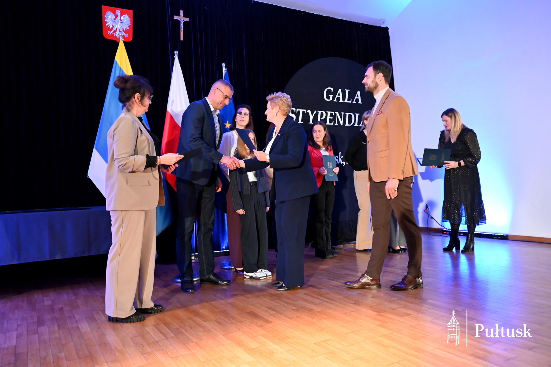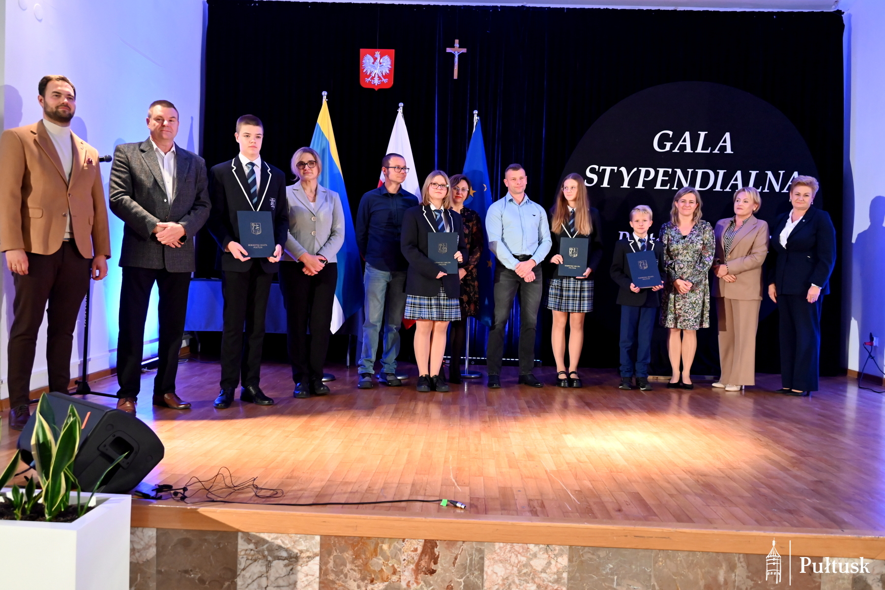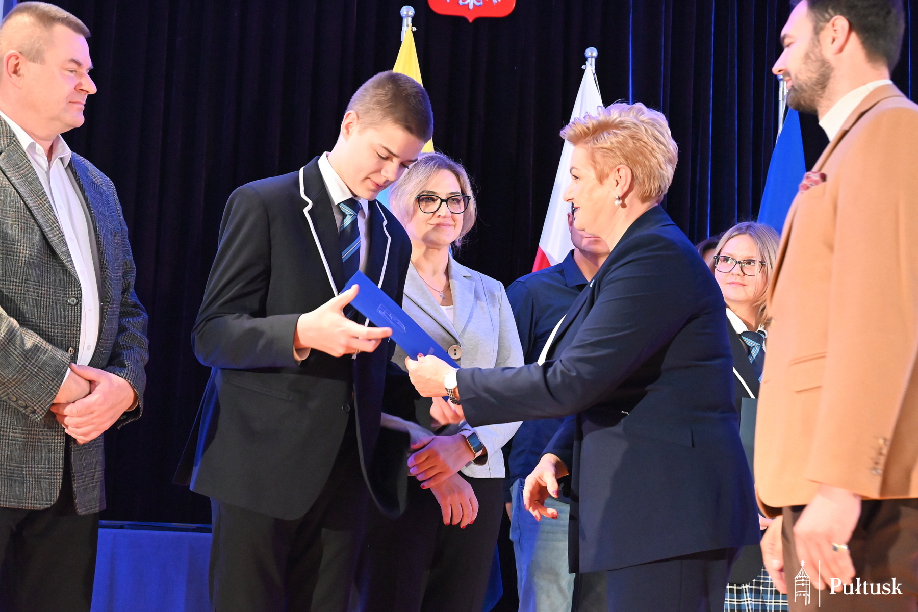 Dyplomy przyznania stypendium naukowego Burmistrza Miasta Pułtusk wręczali Burmistrz Miasta Pułtusk Beata Jóźwiak i Przewodniczący Rady Miejskiej w Pułtusku Łukasz Skarżyński, którym towarzyszyli dyrektorzy szkół: Bożena Kościk (ZS-P w Przemiarowie), Hanna Chojnowska (PSP w Płocochowie), Kamil Grabowski (PSP nr 1 w Pułtusku), Krystyna Estkowska (ZS nr 2 w Pułtusku), Wicedyrektor Małgorzata Kaczmarczyk (PSP nr 3 w Pułtusku) i Krzysztof Łachmański (PSP nr 4 w Pułtusku).