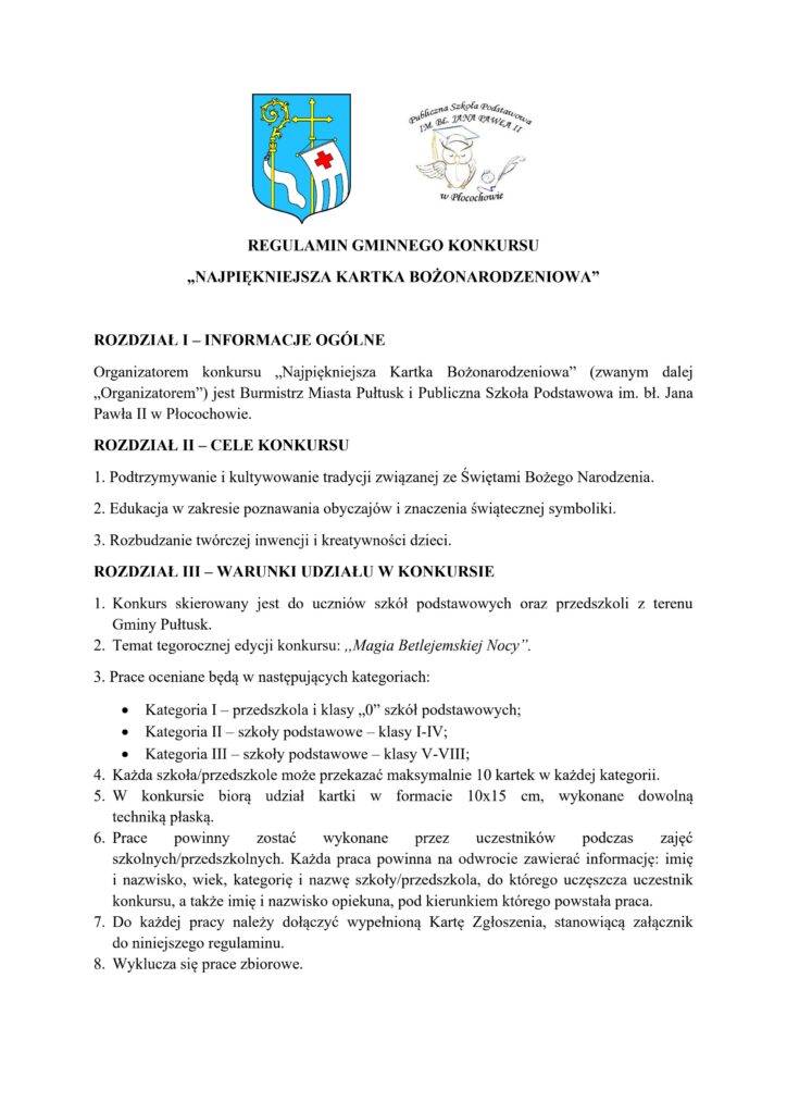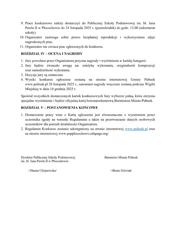 Prace konkursowe należy dostarczyć do Publicznej Szkoły Podstawowej im. bł. Jana Pawła II w Płocochowie do 24 listopada 2025 r. (poniedziałek) do godz. 12.00 (sekretariat szkoły).