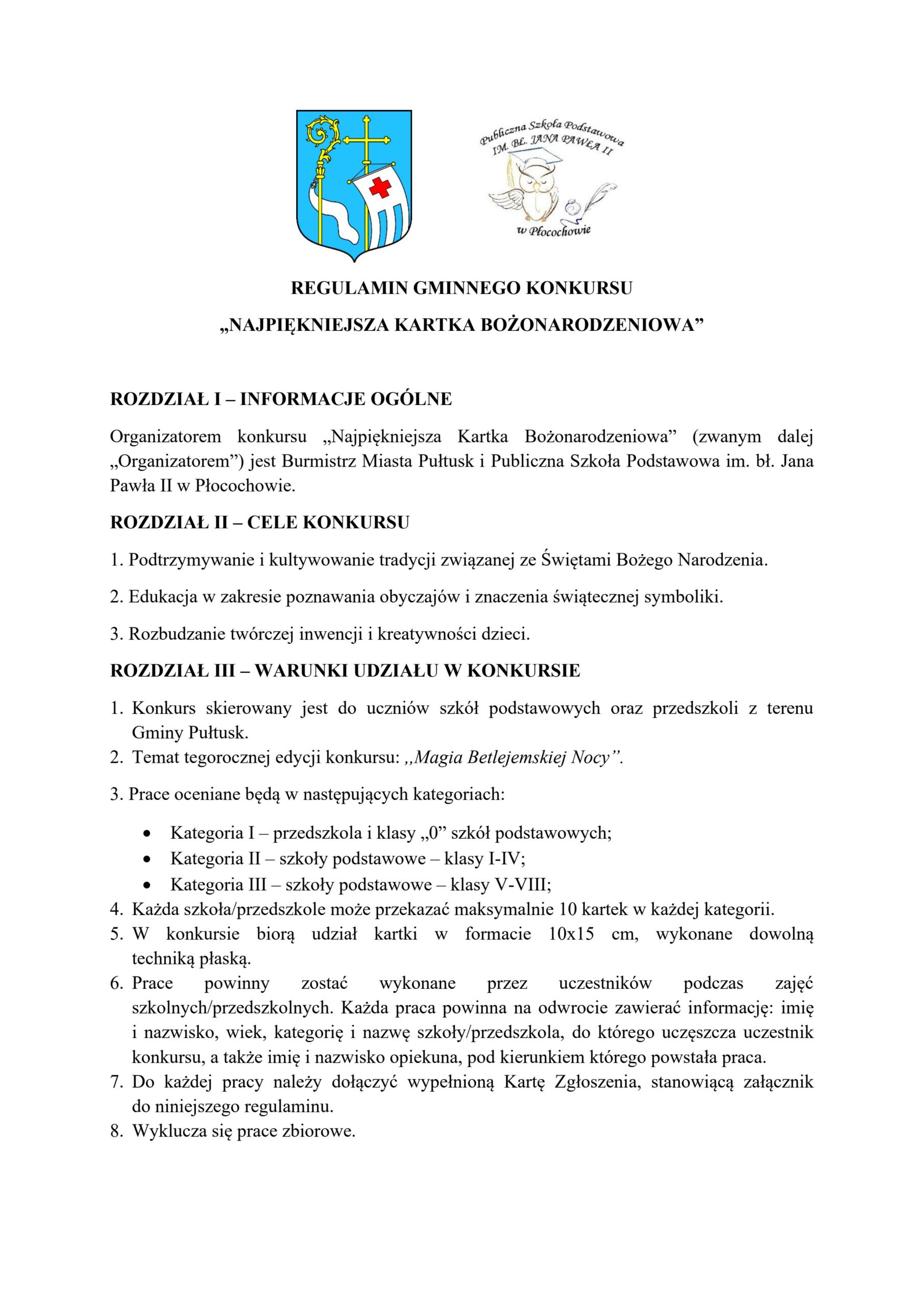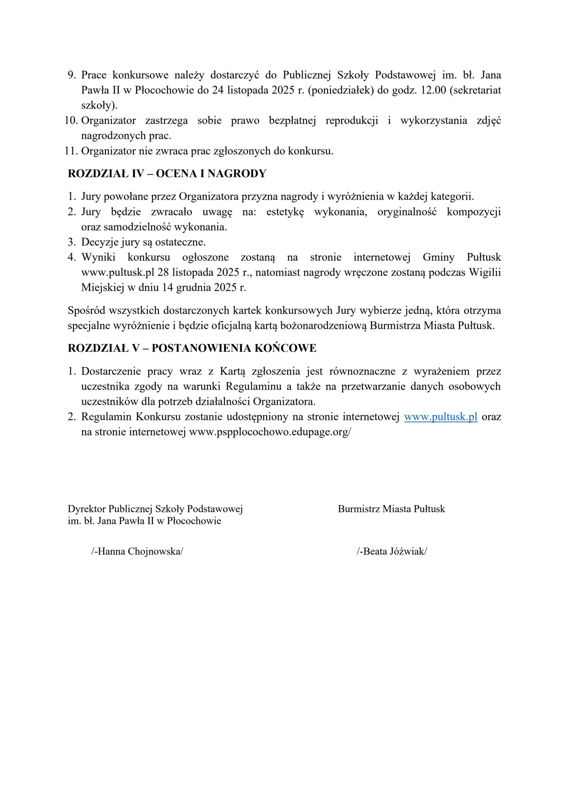 Prace konkursowe należy dostarczyć do Publicznej Szkoły Podstawowej im. bł. Jana Pawła II w Płocochowie do 24 listopada 2025 r. (poniedziałek) do godz. 12.00 (sekretariat szkoły).