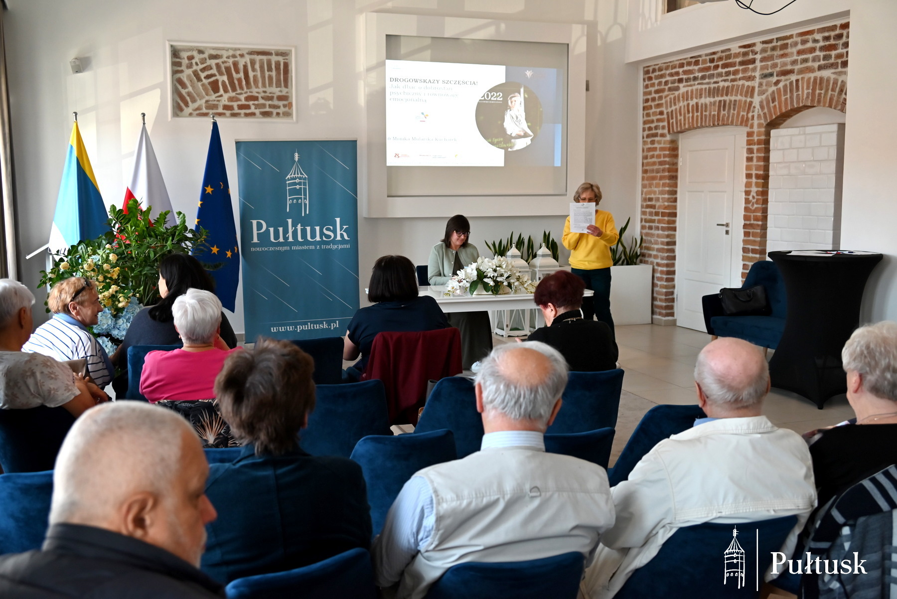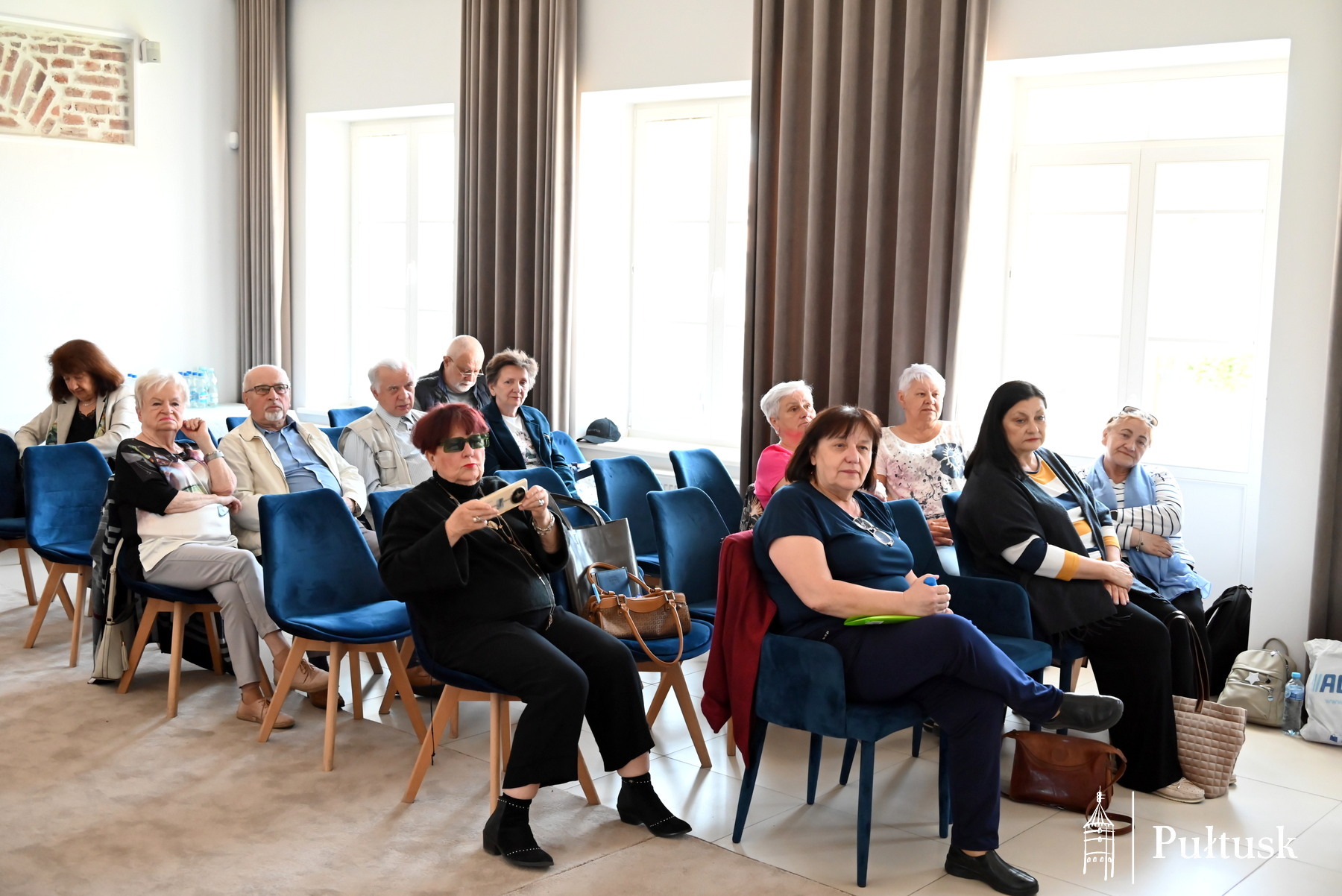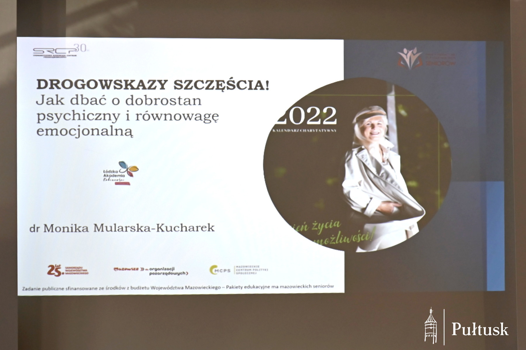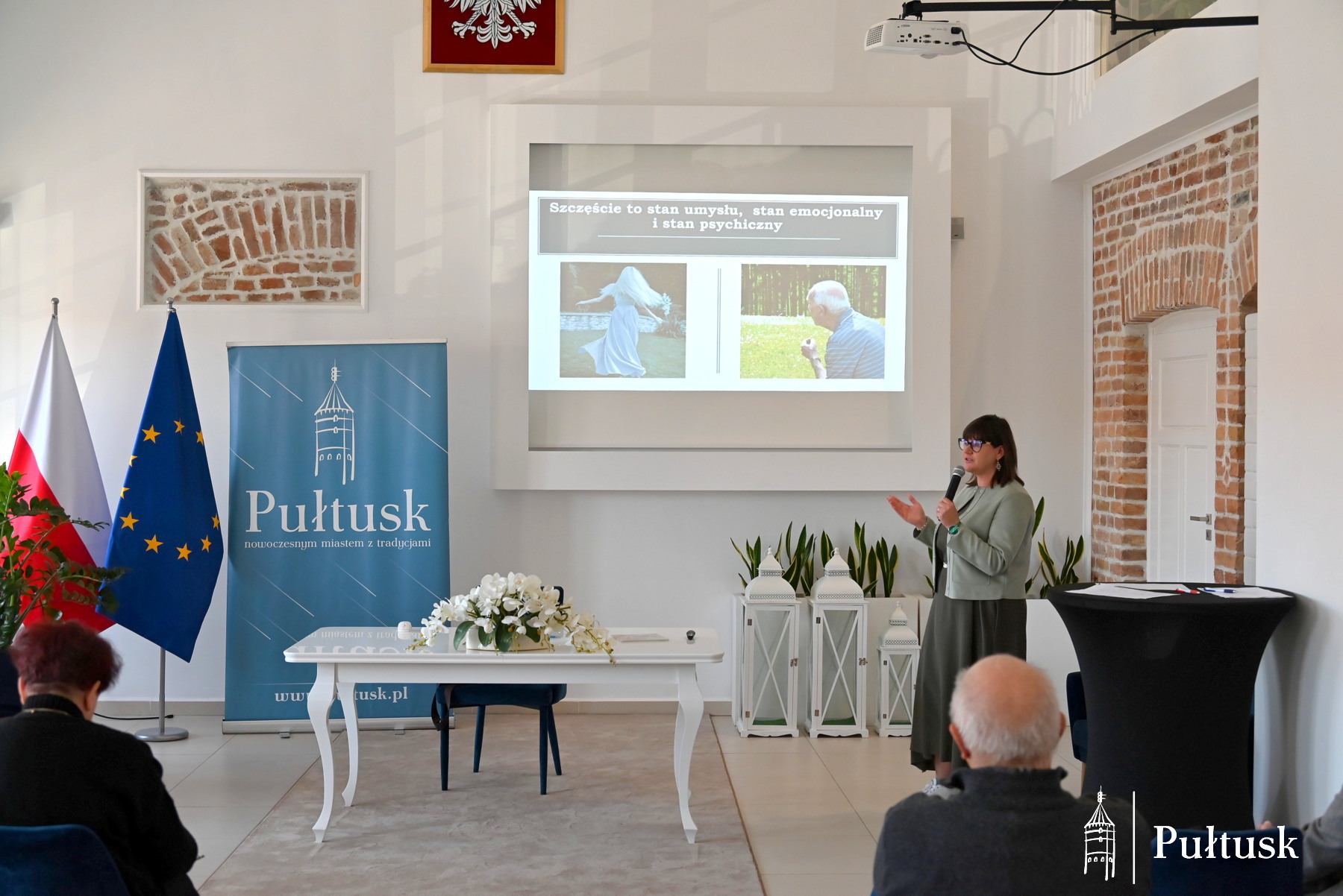 Z inicjatywy Pułtuskiego Stowarzyszenia „Seniorzy-Seniorom” 28 kwietnia 2025 br. w Centrum Dziedzictwa Kulturowego w Pułtusku odbył się otwarty wykład dla Seniorów pt. „Drogowskazy szczęścia! Jak dbać o dobrostan psychiczny i równowagę emocjonalną”, który wygłosiła Pani Monika Mularska-Kucharek – doktor nauk humanistycznych w zakresie socjologii, psycholog w trakcie kształcenia, wykładowca akademicki, autorka książek z zakresu rozwoju osobistego, psychologii pozytywnej i jakości życia, poetka, ekspertka ds. rozwoju osobistego osób dojrzałych, trenerka biznesu, terapeutka, propagatorka pozytywnego myślenia i troski o dobrostan, prezeska Fundacji Łódzka Akademia Kobiecości.