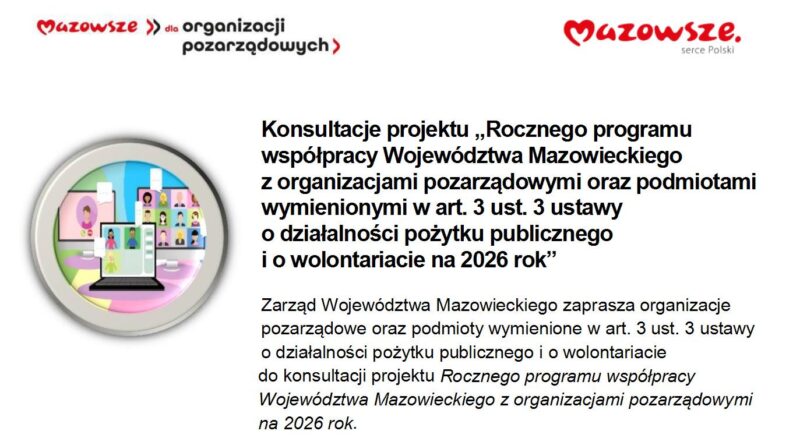 Konsultacje projektu „Rocznego programu współpracy Województwa Mazowieckiego z organizacjami pozarządowymi oraz podmiotami wymienionymi w art. 3 ust. 3 ustawy o działalności pożytku publicznego i o wolontariacie na 2026 rok”