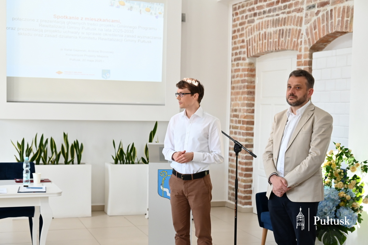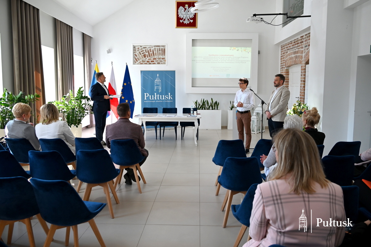 20 maja 2025 r. w Centrum Dziedzictwa Kulturowego w Pułtusku odbyły się konsultacje społeczne dotyczące: projektu Gminnego Programu Rewitalizacji Gminy Pułtusk na lata 2025–2035 oraz projektu uchwały w sprawie określenia zasad wyznaczania składu oraz działania Komitetu Rewitalizacji.