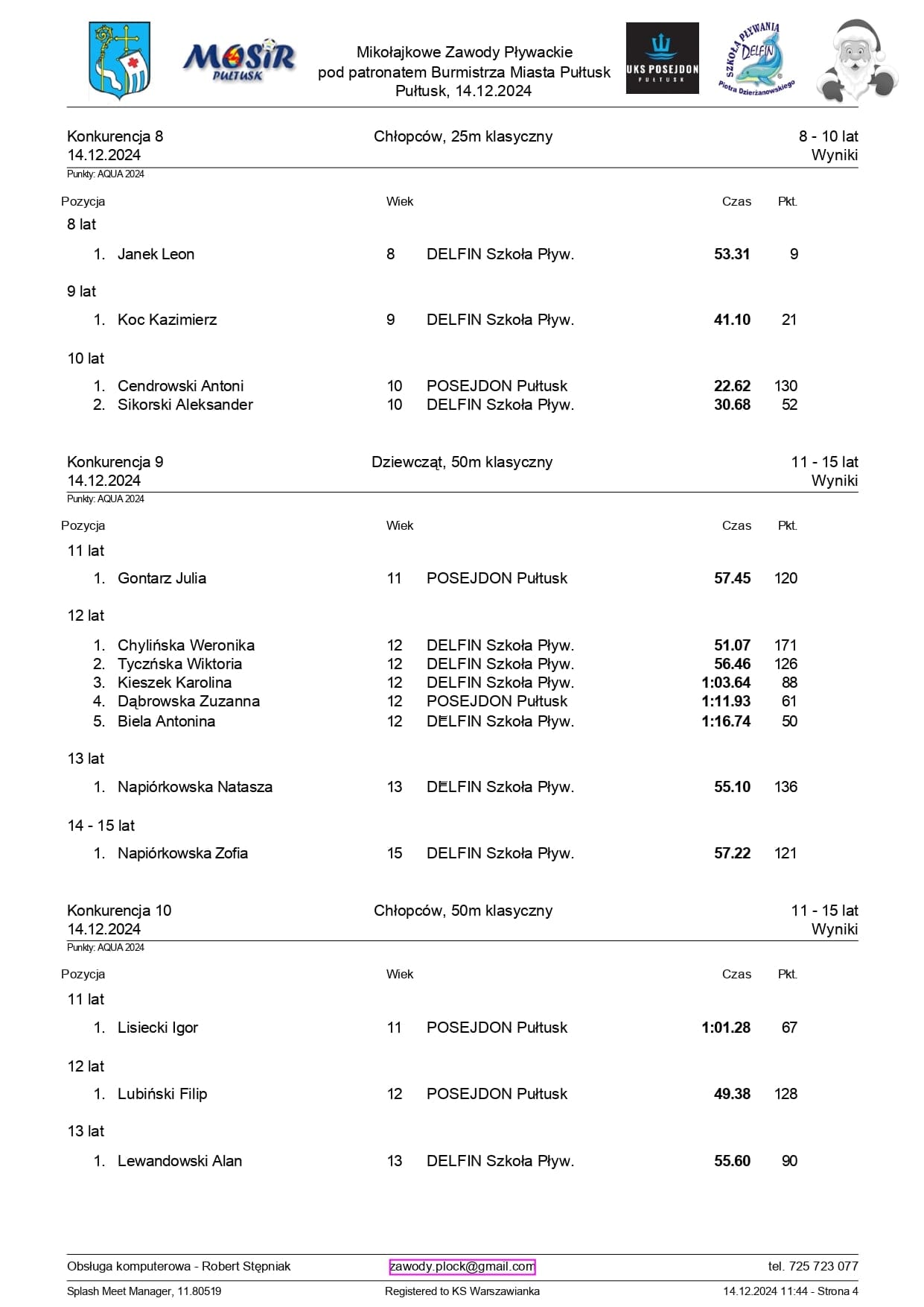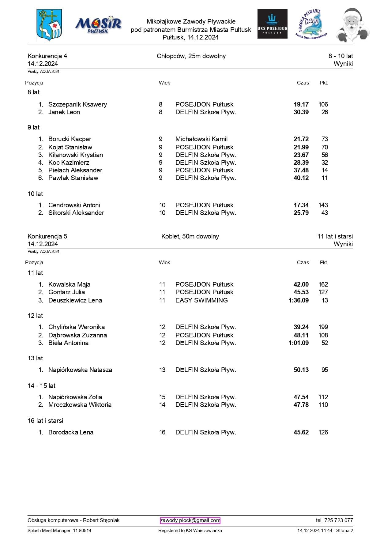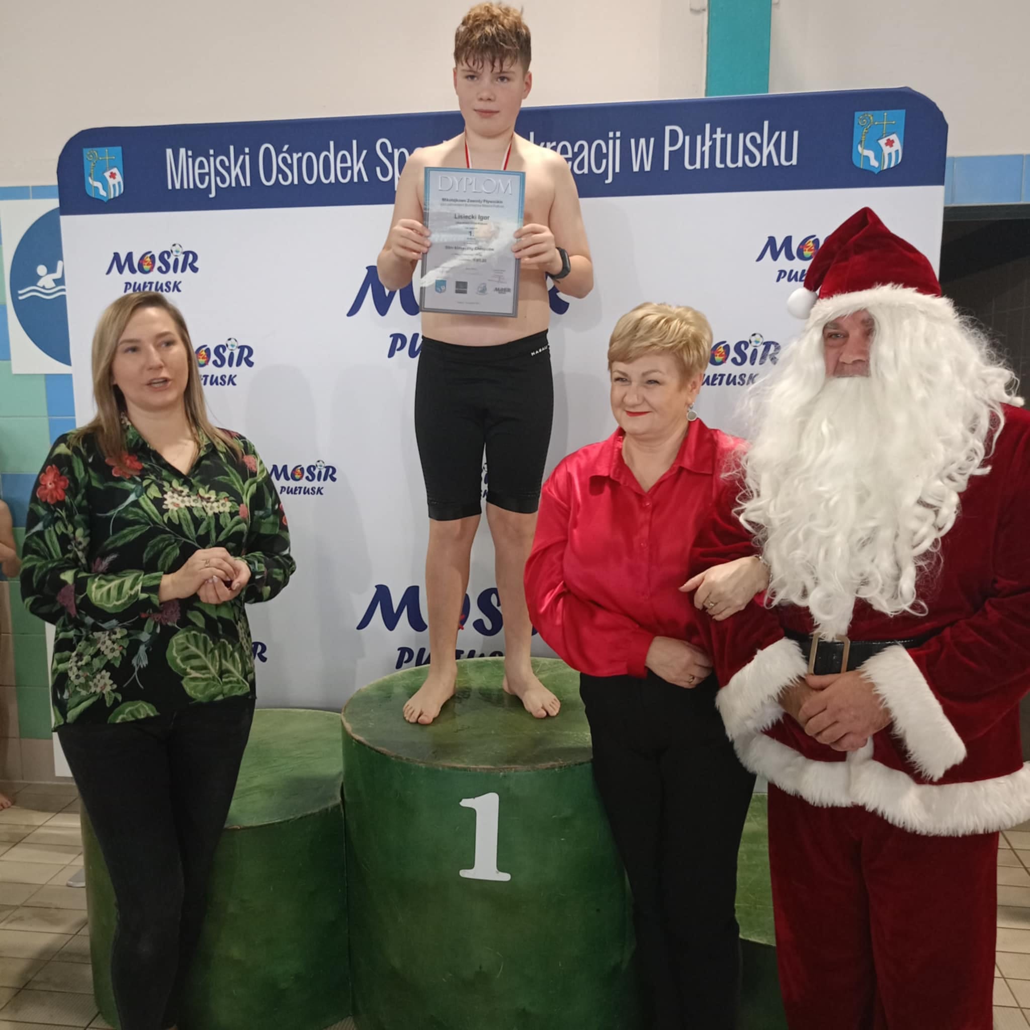 W sobotę 14 grudnia 2024 r. na pływalni Miejskiego Ośrodka Sportu i Rekreacji w Pułtusku ponad 60 dzieci rywalizowało w tradycyjnych już „Mikołajkowych zawodach pływackich”. Organizatorami zawodów, które odbywały się pod patronatem Burmistrza Miasta Pułtusk, byli: pułtuski MOSiR, UKS POSEJDON i Szkoła Pływania Delfin. Zmaganiom towarzyszyła świąteczna atmosfera, nie zabrakło wizyty Świętego Mikołaja, który już na początku zawodów każdego uczestnika obdarował słodkim upominkiem i wejściówką na pływalnię.