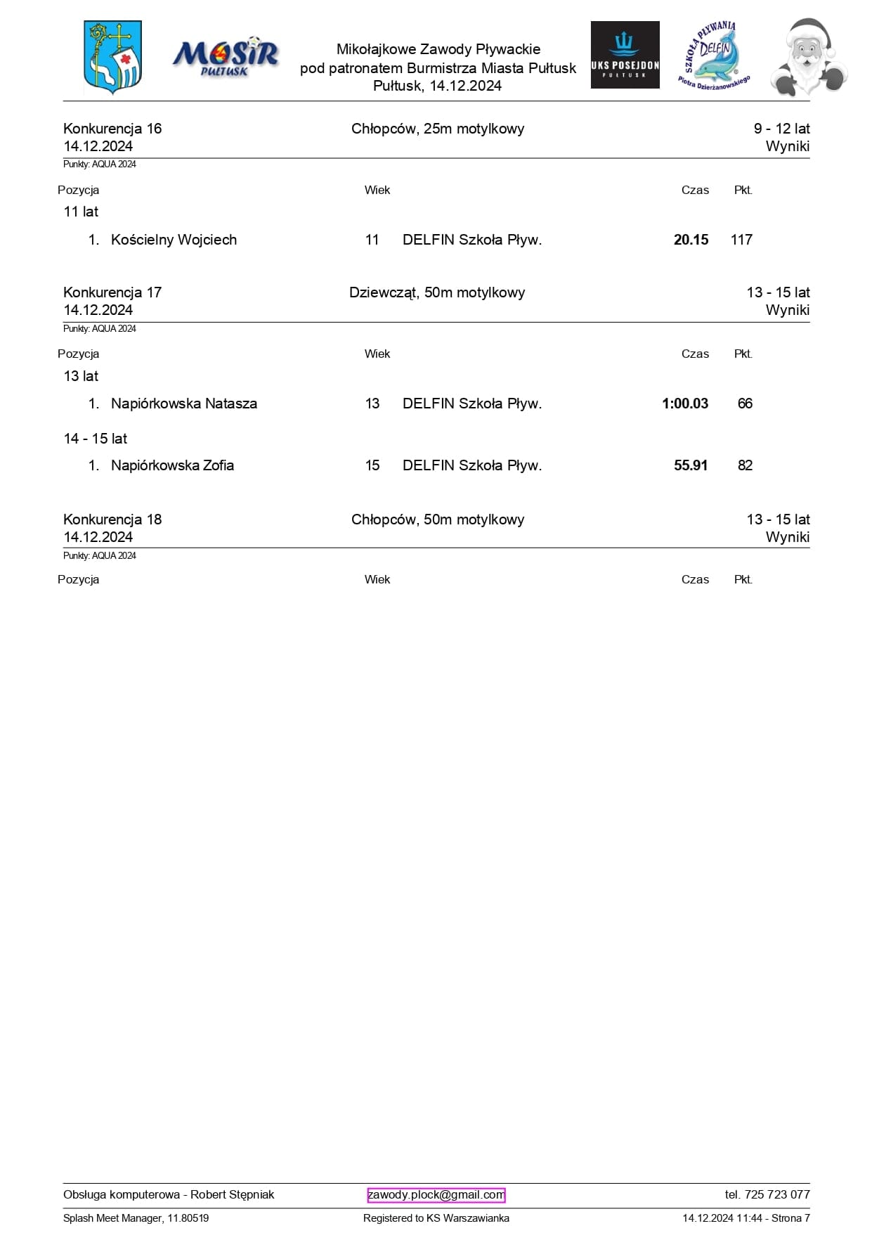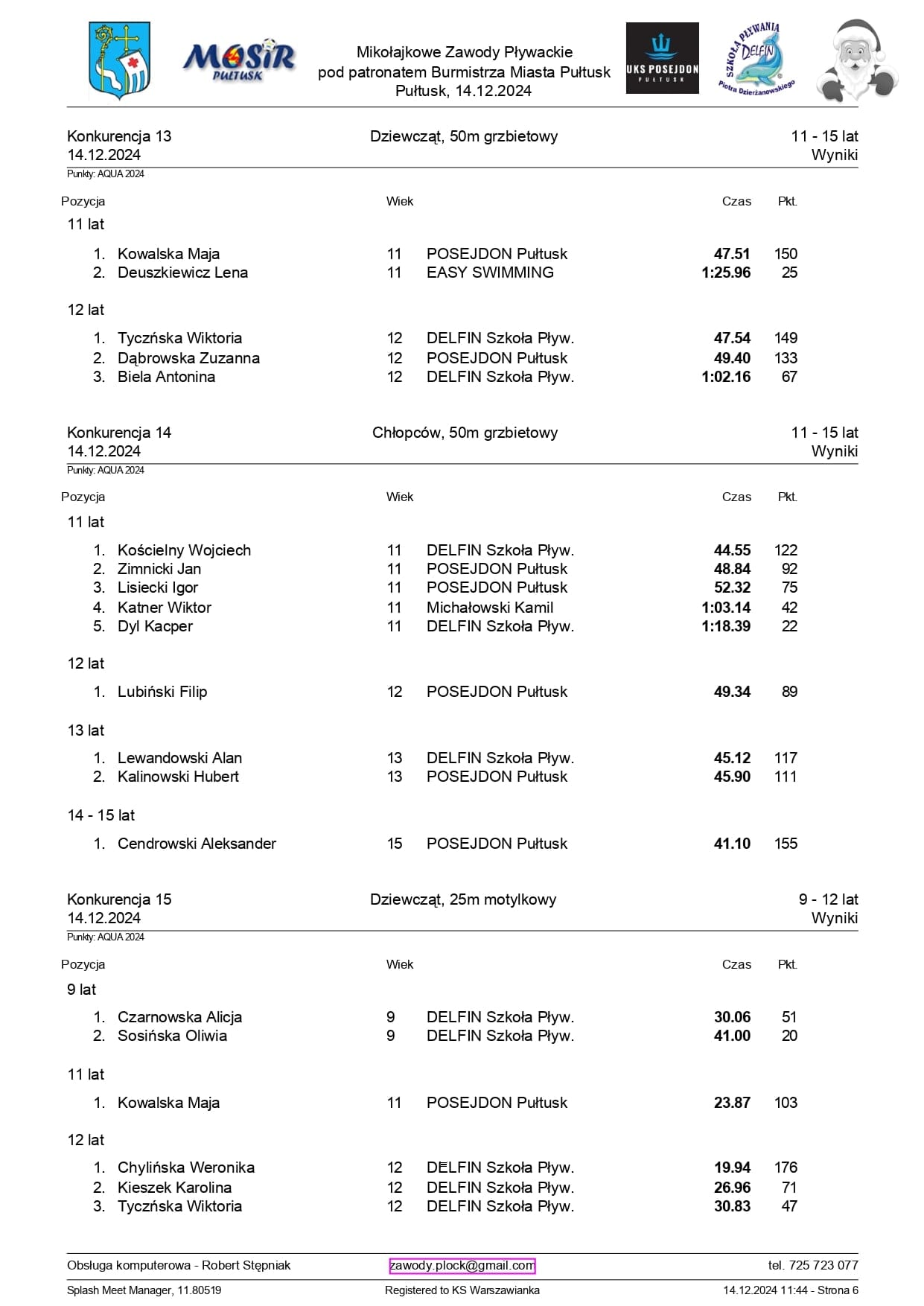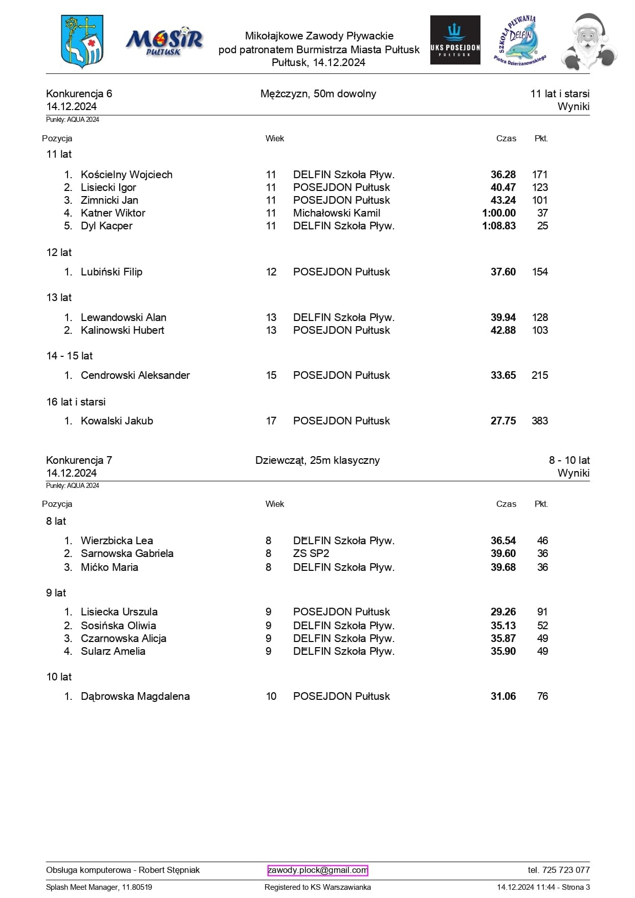 W sobotę 14 grudnia 2024 r. na pływalni Miejskiego Ośrodka Sportu i Rekreacji w Pułtusku ponad 60 dzieci rywalizowało w tradycyjnych już „Mikołajkowych zawodach pływackich”. Organizatorami zawodów, które odbywały się pod patronatem Burmistrza Miasta Pułtusk, byli: pułtuski MOSiR, UKS POSEJDON i Szkoła Pływania Delfin. Zmaganiom towarzyszyła świąteczna atmosfera, nie zabrakło wizyty Świętego Mikołaja, który już na początku zawodów każdego uczestnika obdarował słodkim upominkiem i wejściówką na pływalnię.