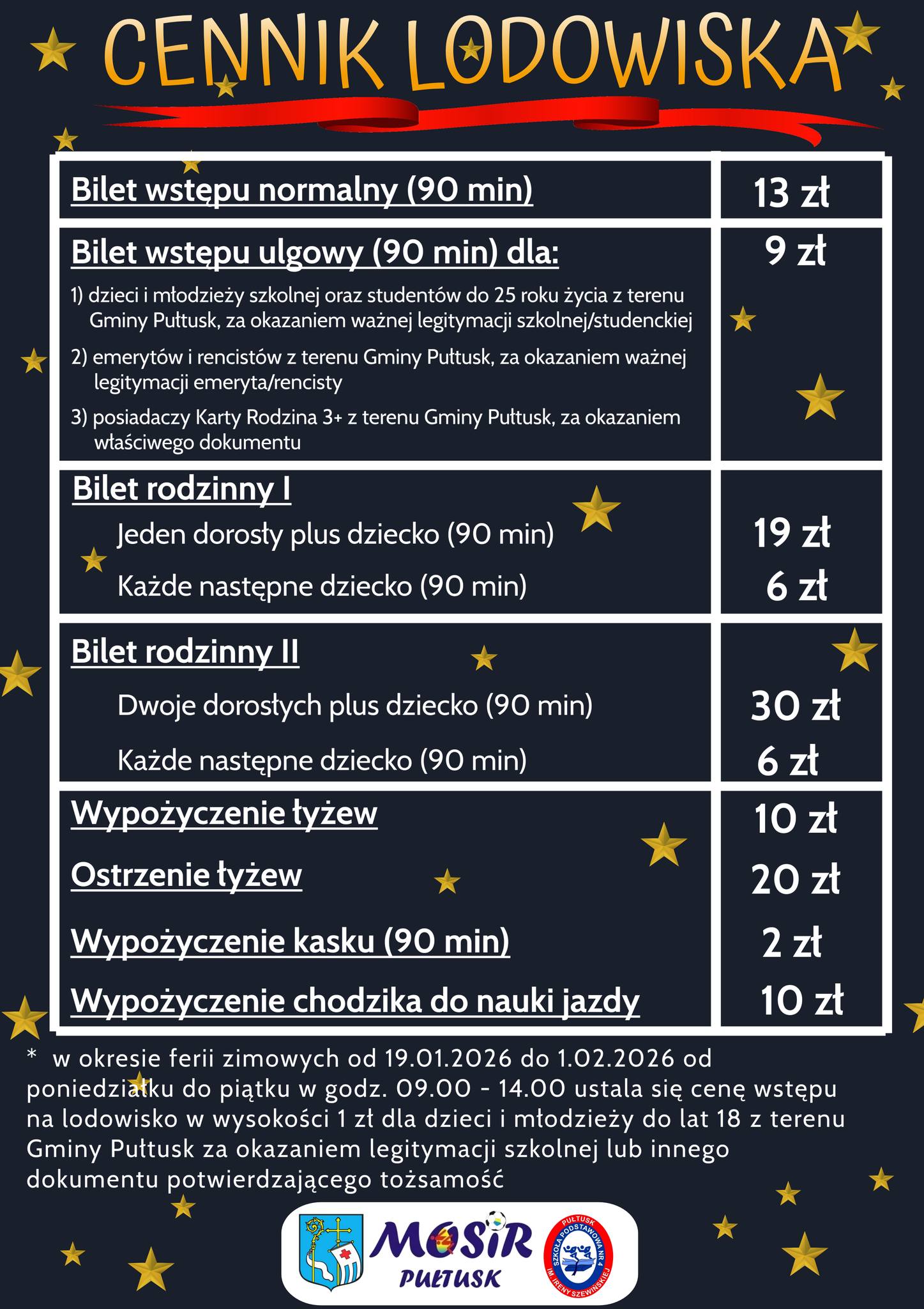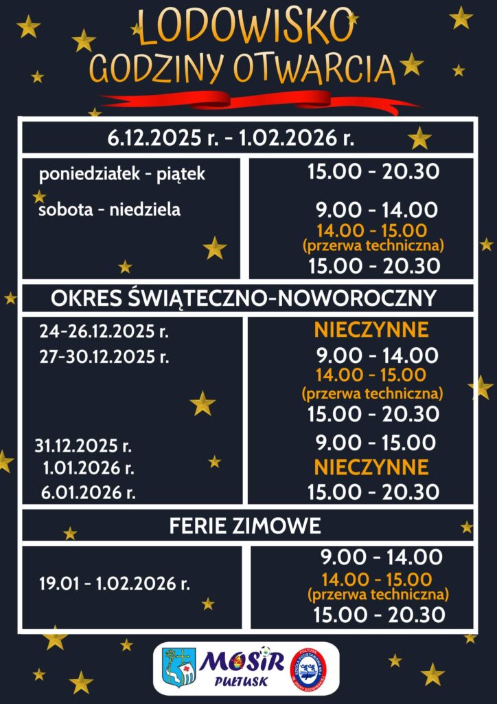 Godziny otwarcia lodowiska: poniedziałek–piątek: 15:00–20:30;  weekendy: 9:00–20:30.