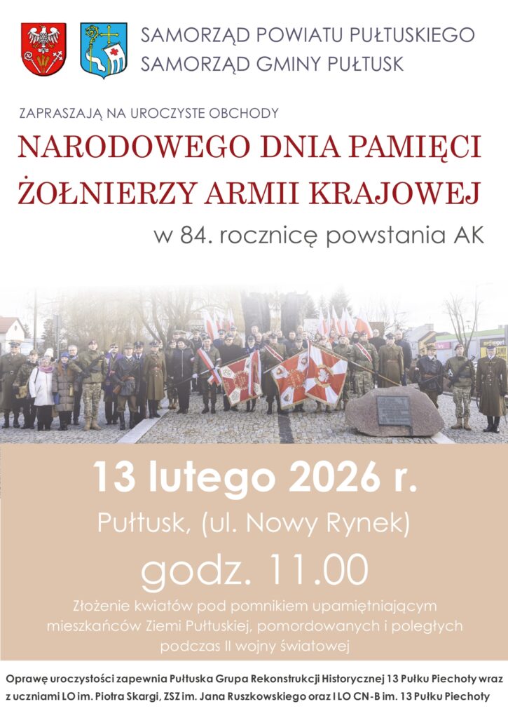 Samorząd Powiatu Pułtuskiego oraz Samorząd Gminy Pułtusk zapraszają do udziału w uroczystych obchodach 84. rocznicy powstania Armii Krajowej.