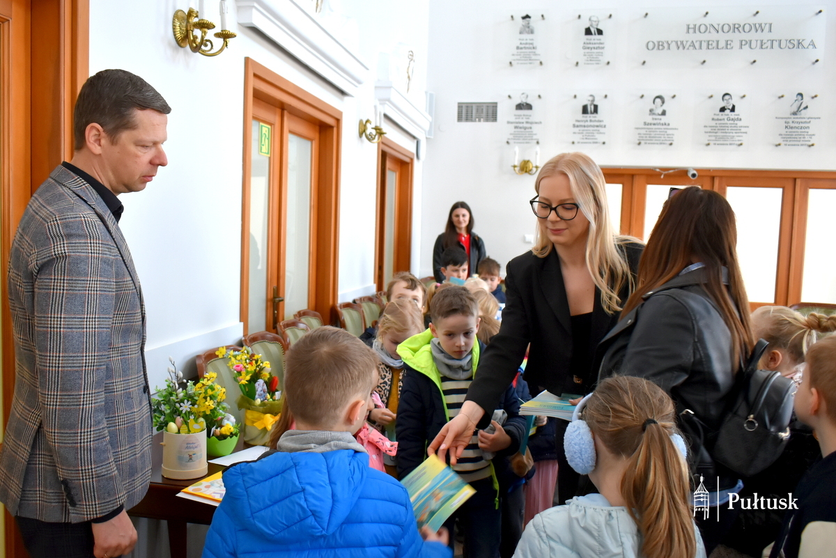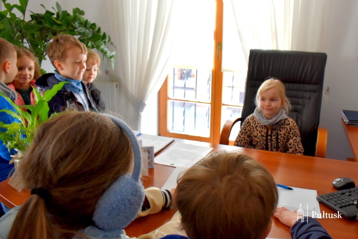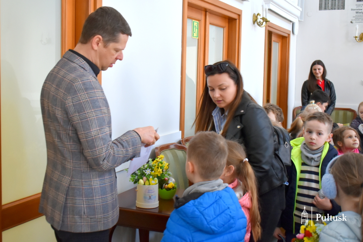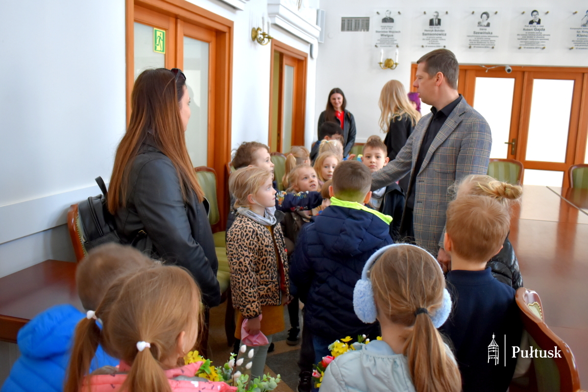 1 kwietnia, podczas wiosennego spaceru, dzieci z Przedszkola Miejskiego nr 4 odwiedziły Urząd Miejski w Pułtusku. Pierwszy Zastępca Burmistrza Miasta Pułtusk Mateusz Miłoszewski przygotował dla nich niecodzienną niespodziankę primaaprilisową. Najmłodsi goście mieli okazję zasiąść w fotelu burmistrza i – z dużym zaangażowaniem oraz uśmiechem – stemplować pieczątką z datą kolorowanki wcześniej otrzymane od burmistrza. Zamiana ról wywołała wiele pozytywnych emocji i stała się dla dzieci ciekawym doświadczeniem.