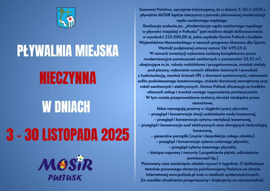 uprzejmie informujemy, że w dniach 3-30.11.2025 r. pływalnia MOSiR będzie nieczynna z powodu planowanej modernizacji węzła sanitarnego męskiego.