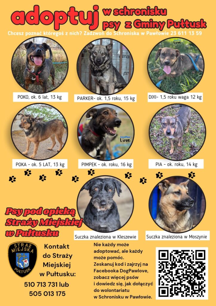 Na terenie Gminy Pułtusk przebywają psy, które czekają na odpowiedzialnych opiekunów i nowy dom. Zwierzęta znajdują się pod opieką schroniska w Pawłowie oraz Straży Miejskiej w Pułtusku. Każde z nich potrzebuje troski, bezpieczeństwa i szansy na lepsze życie u boku człowieka.
