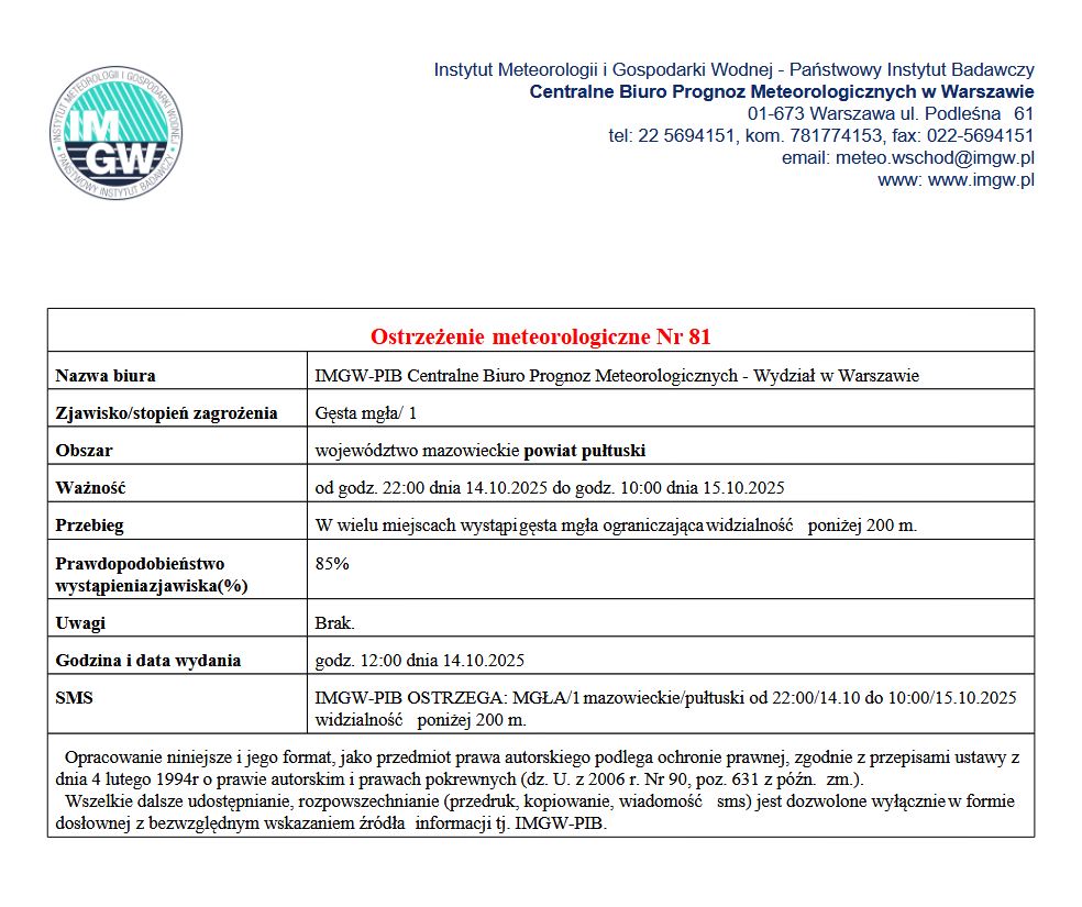 w Warszawie informujemy, że od godz. 22:00 dnia 14.10.2025 r. do godz. 10:00 dnia 15.10.2025 r. na terenie Gminy Pułtusk wystąpią gęste mgły, w zasięgu których widzialność może wynosić poniżej 200 m. Prawdopodobieństwo wystąpienia zjawiska: 85 %.