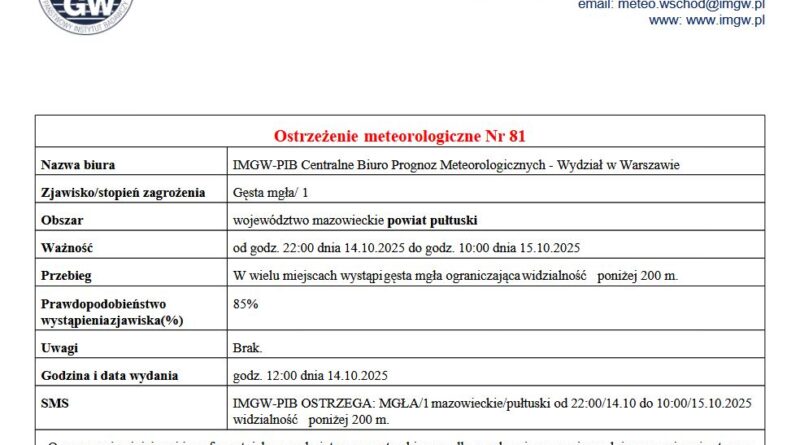 w Warszawie informujemy, że od godz. 22:00 dnia 14.10.2025 r. do godz. 10:00 dnia 15.10.2025 r. na terenie Gminy Pułtusk wystąpią gęste mgły, w zasięgu których widzialność może wynosić poniżej 200 m. Prawdopodobieństwo wystąpienia zjawiska: 85 %.