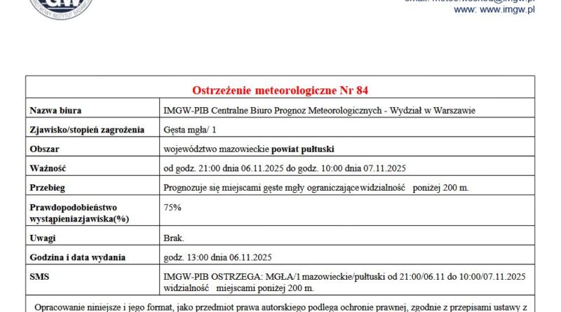 w Warszawie informujemy, że od godz. 21:00 dnia 6.11.2025 r. do godz. 10:00 dnia 7.11.2025 r. na terenie Gminy Pułtusk wystąpią gęste mgły, w zasięgu których widzialność może wynosić poniżej 200 m. Prawdopodobieństwo wystąpienia zjawiska: 75 %.
