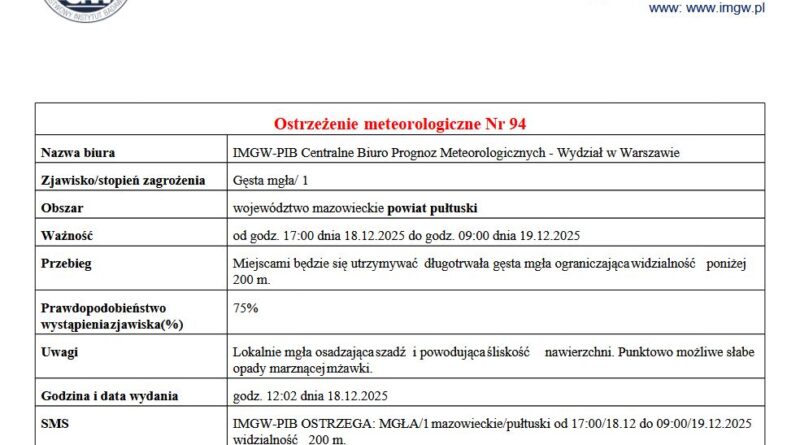 w Warszawie informujemy, że od godz. 17:00 dnia 18.12.2025 r. do godz. 09:00 dnia 19.12.2025 r. na terenie Gminy Pułtusk wystąpią gęste mgły, w zasięgu których widzialność może miejscami wynosić poniżej 200 m. Mgły lokalnie mogą osadzać szadź, powodując śliskość nawierzchni dróg i chodników. Możliwe słabe opady marznącej mżawki.