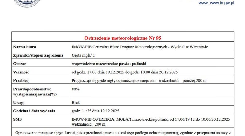 w Warszawie informujemy, że od godz. 17:00 dnia 19.12.2025 r. do godz. 10:00 dnia 20.12.2025 r. na terenie Gminy Pułtusk wystąpią gęste mgły, w zasięgu których widzialność może miejscami wynosić poniżej 200 m..