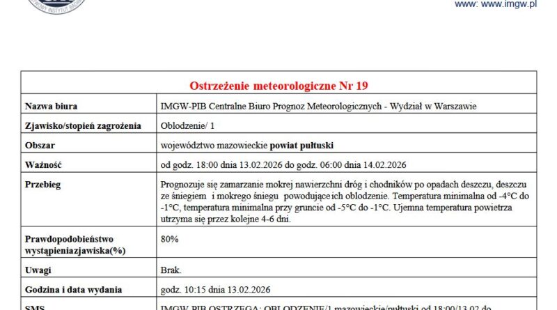 w Warszawie informujemy, że od godz. 18:00 dnia 13.02.2026 r. do godz. 06:00 dnia 14.02.2026 r. na terenie Gminy Pułtusk prognozuje się zamarzanie mokrej nawierzchni dróg i chodników po opadach deszczu, deszczu ze śniegiem i mokrego śniegu powodujące ich oblodzenie. Temperatura minimalna od -4°C do -1°C, temperatura minimalna przy gruncie od -5°C do -1°C. Ujemna temperatura powietrza utrzyma się przez kolejne 4-6 dni.