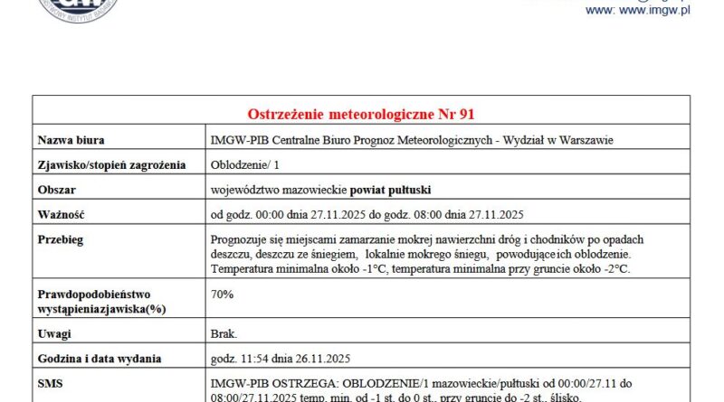 w Warszawie informujemy, że od godz. 00:00 dnia 27.11.2025 r. do godz. 08:00 dnia 27.11.2025 r. na terenie Gminy Pułtusk prognozuje się zamarzanie mokrej nawierzchni dróg i chodników po opadach deszczu, deszczu ze śniegiem i mokrego śniegu powodujące ich oblodzenie. Temperatura minimalna około -1°C, temperatura minimalna przy gruncie około -2°C.