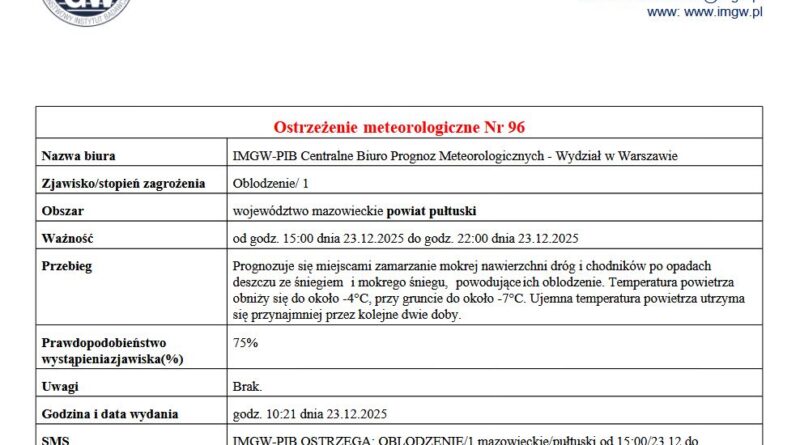 w Warszawie informujemy, że od godz. 15:00 dnia 23.12.2025 r. do godz. 22:00 dnia 23.12.2025 r. na terenie Gminy Pułtusk prognozuje się zamarzanie mokrej nawierzchni dróg i chodników po opadach deszczu, deszczu ze śniegiem powodujące ich oblodzenie. Temperatura powietrza obniży się do około -4°C, temperatura minimalna przy gruncie około -7°C. Ujemna temperatura powietrza utrzyma się przynajmniej przez kolejne dwie doby.