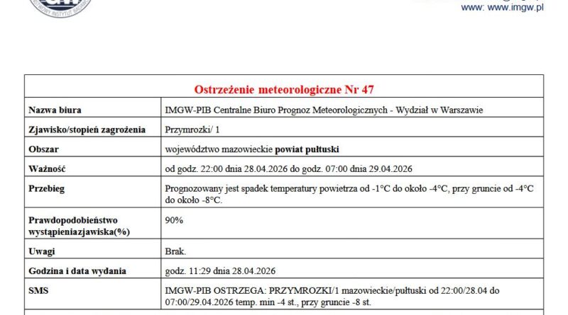 w Warszawie informujemy, że od godz. 22:00 dnia 28.04.2026 r. do godz. 07:00 dnia 29.04.2026 r. na terenie Gminy prognozowany jest spadek temperatury powietrza od -1°C do około -4°C, przy gruncie od -4°C do około -8°C.
