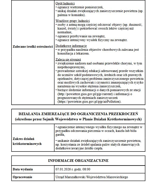 W związku z ryzykiem przekroczenia poziomu pyłu zawieszonego PM10 w powietrzu na obszarze województwa mazowieckiego Departament Monitoringu Środowiska Głównego Inspektoratu Ochrony Środowiska ogłasza ostrzeżenie poziomu 0 obowiązujące od godz. 9.00 dnia 07.01.2026 r. do godz. 24.00 dnia 07.01.2026 r. na terenie gminy Pułtusk.