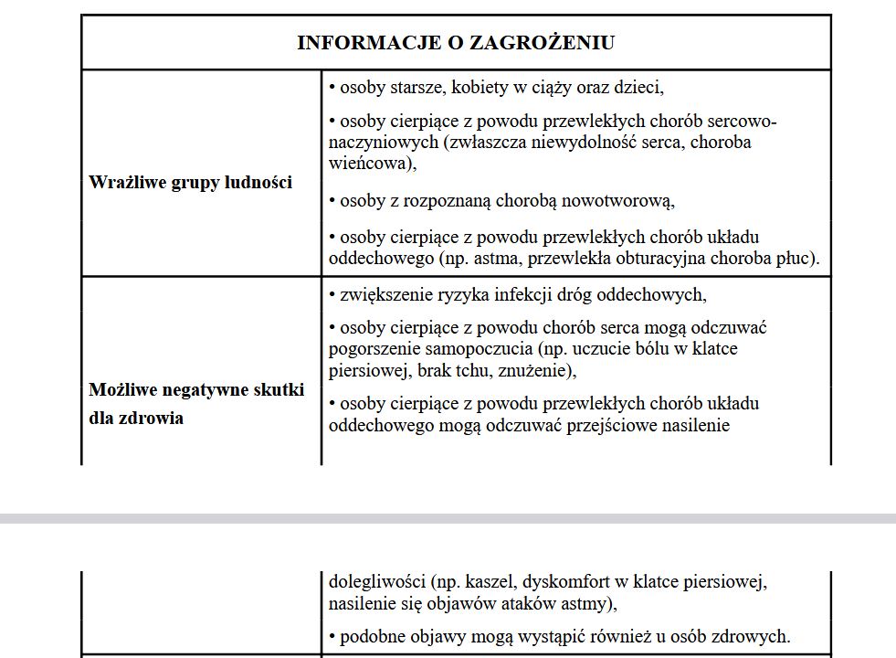 Ze względu na rodzaj zagrożenia szczególną ostrożność powinny zachować kobiety w ciąży, dzieci i młodzież poniżej 25 roku życia, osoby cierpiące z powodu przewlekłych chorób sercowo-naczyniowych, osoby z rozpoznaną chorobą nowotworową, osoby starsze i w podeszłym wieku, osoby z zaburzeniami funkcjonowania układu oddechowego, osoby z zaburzeniami funkcjonowania układu krwionośnego. Zalecane środki ostrożności to m.in. ograniczenie wietrzenia pomieszczeń, ograniczenie wysiłku fizycznego na zewnątrz.