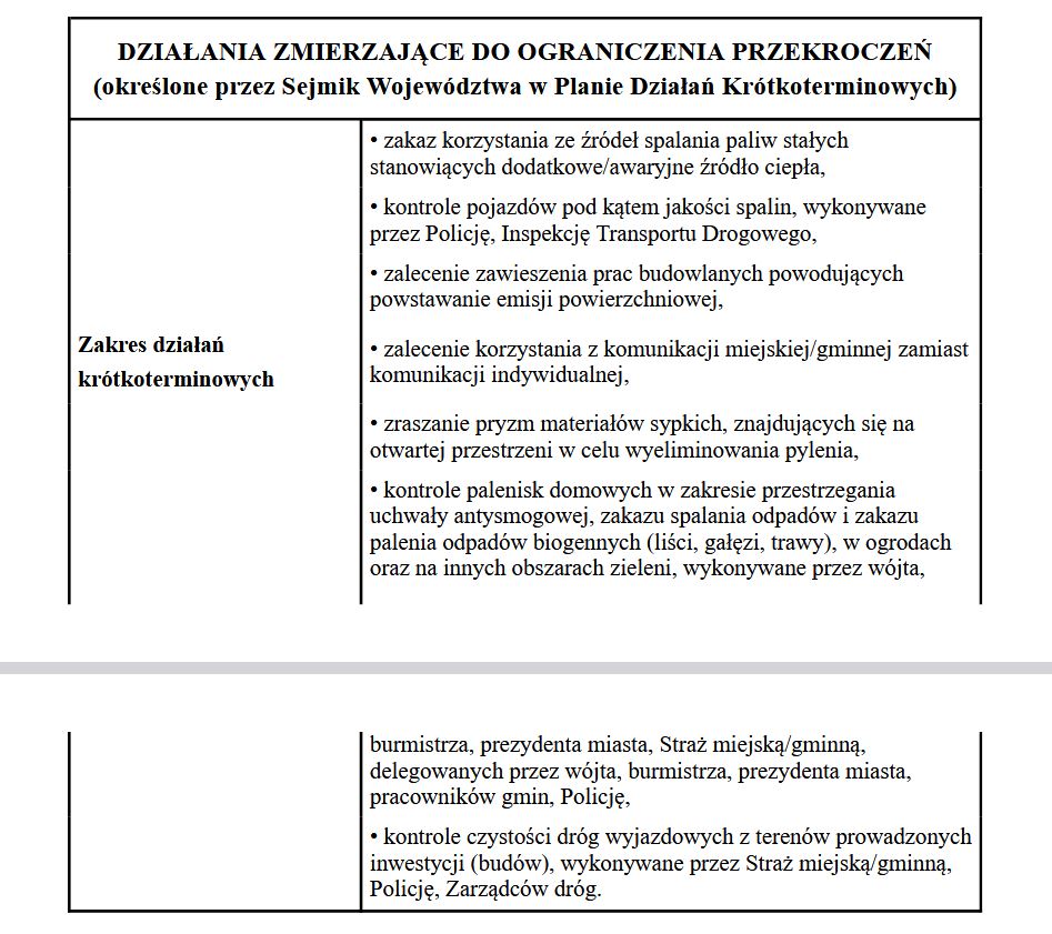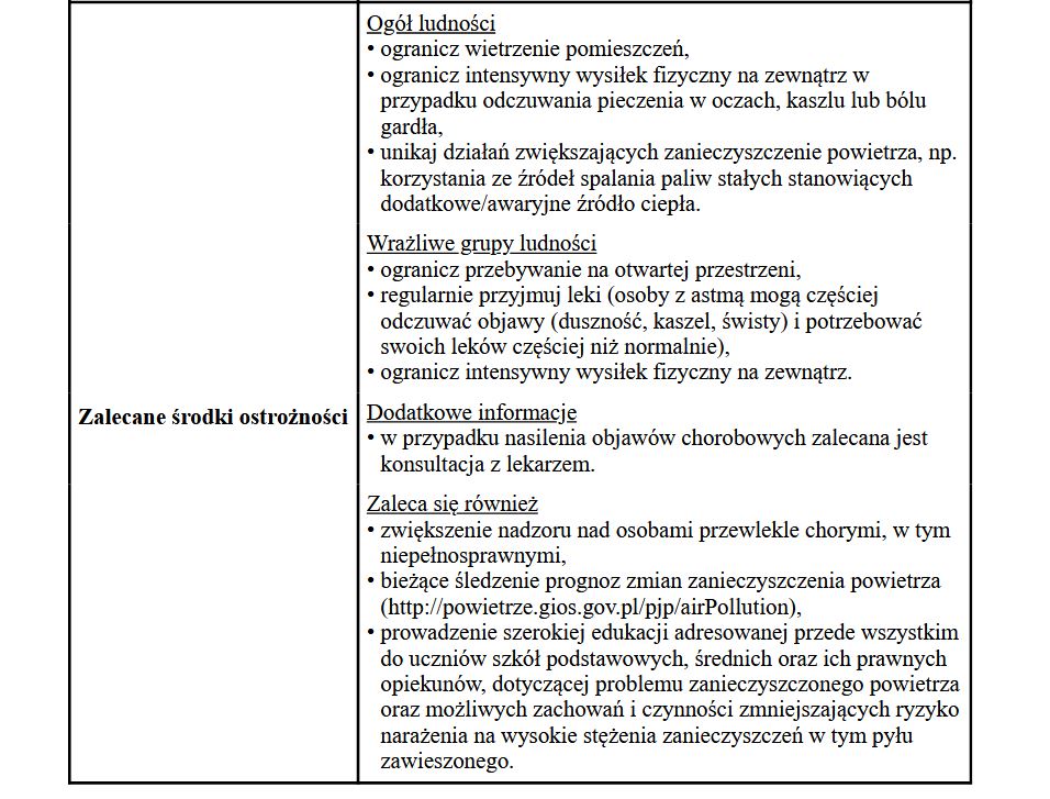 W ramach działań zmierzających do zminimalizowania przekroczeń zaleca się unikanie działań zwiększających zanieczyszczenie powietrza np. korzystanie ze źródeł spalania paliw stałych stanowiących dodatkowe/awaryjne źródło ciepła, zawieszenie prac budowlanych powodujących powstawanie emisji powierzchniowej, korzystanie w miarę możliwości z komunikacji miejskiej zamiast komunikacji indywidualnej.