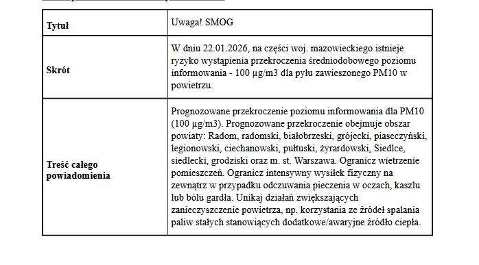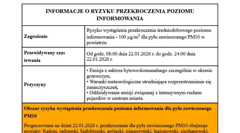 W związku z ryzykiem przekroczenia poziomu pyłu zawieszonego PM10 w powietrzu na obszarze województwa mazowieckiego Departament Monitoringu Środowiska Głównego Inspektoratu Ochrony Środowiska ogłasza ostrzeżenie poziomu 2 obowiązujące od godz. 8.00 dnia 22.01.2026 r. do godz. 24.00 dnia 22.01.2026 r. na terenie gminy Pułtusk.