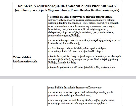 W ramach działań zmierzających do zminimalizowania przekroczeń zaleca się unikanie działań zwiększających zanieczyszczenie powietrza np. korzystanie ze źródeł spalania paliw stałych stanowiących dodatkowe/awaryjne źródło ciepła, zawieszenie prac budowlanych powodujących powstawanie emisji powierzchniowej, korzystanie w miarę możliwości z komunikacji miejskiej zamiast komunikacji indywidualnej.