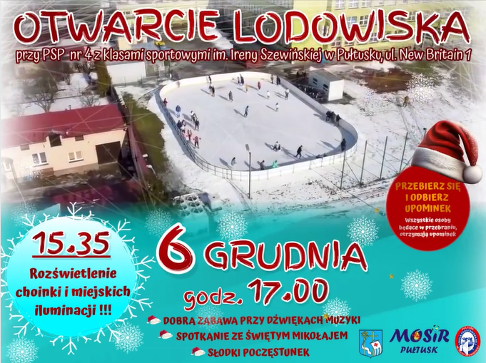 Miejski Ośrodek Sportu i Rekreacji w Pułtusku serdecznie zaprasza wszystkich mieszkańców na wyjątkowe, mikołajkowe otwarcie sezonu zimowego. Już 6 grudnia nastąpi uroczyste otwarcie lodowiska przy PSP nr 4 z klasami sportowymi im. Ireny Szewińskiej, mieszczącej się przy ul. New Britain 1.