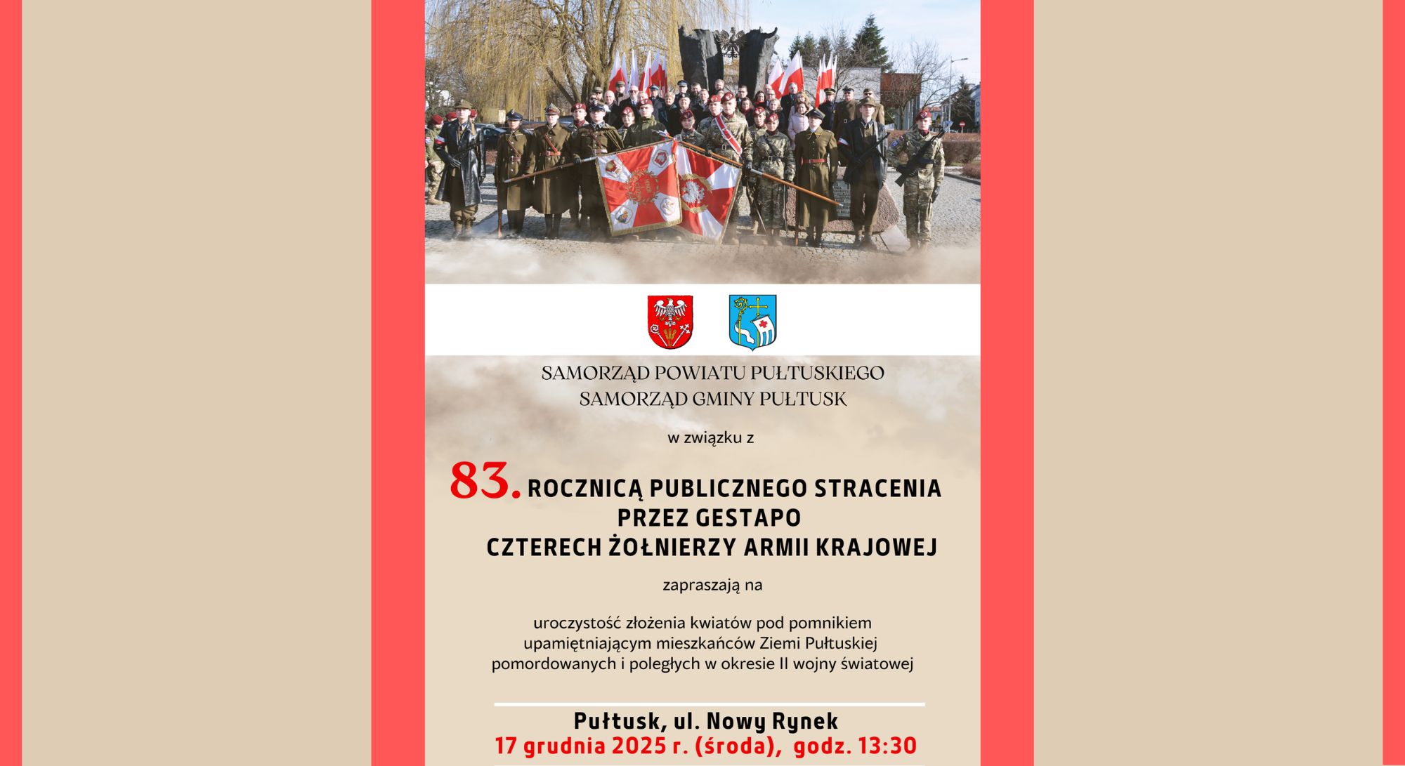 Samorząd Powiatu Pułtuskiego oraz Samorząd Gminy Pułtusk w związku z 83. rocznicą publicznego stracenia praz gestapo czterech żołnierzy Armii Krajowej...