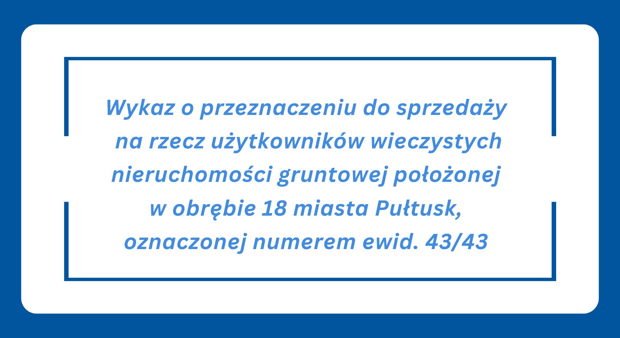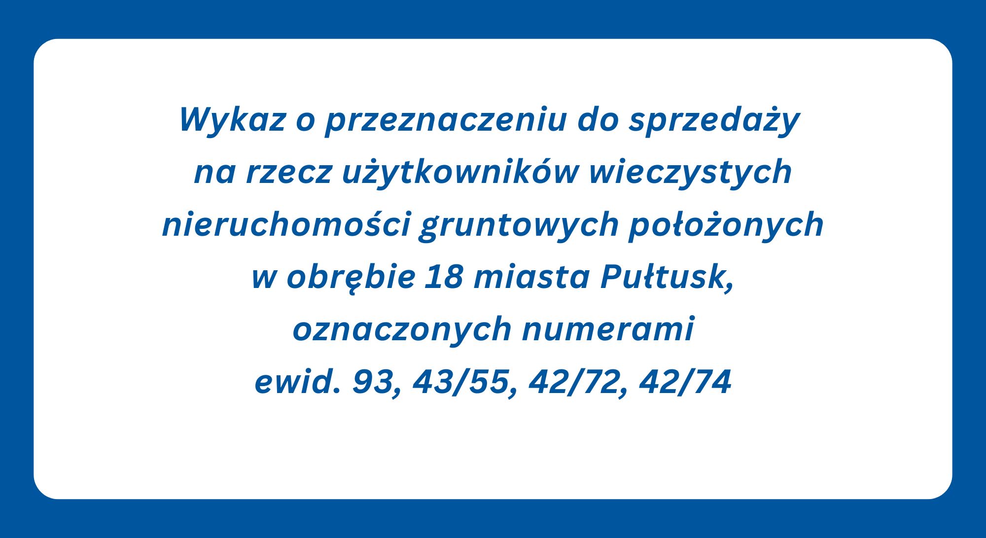 Burmistrz Miasta Pułtusk informuje, że przeznaczone zostały do sprzedaży na rzecz użytkowników wieczystych nieruchomości gruntowe stanowiące własność Gminy Pułtusk, położone...