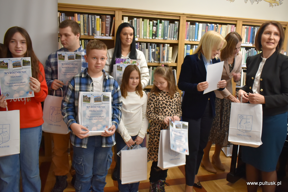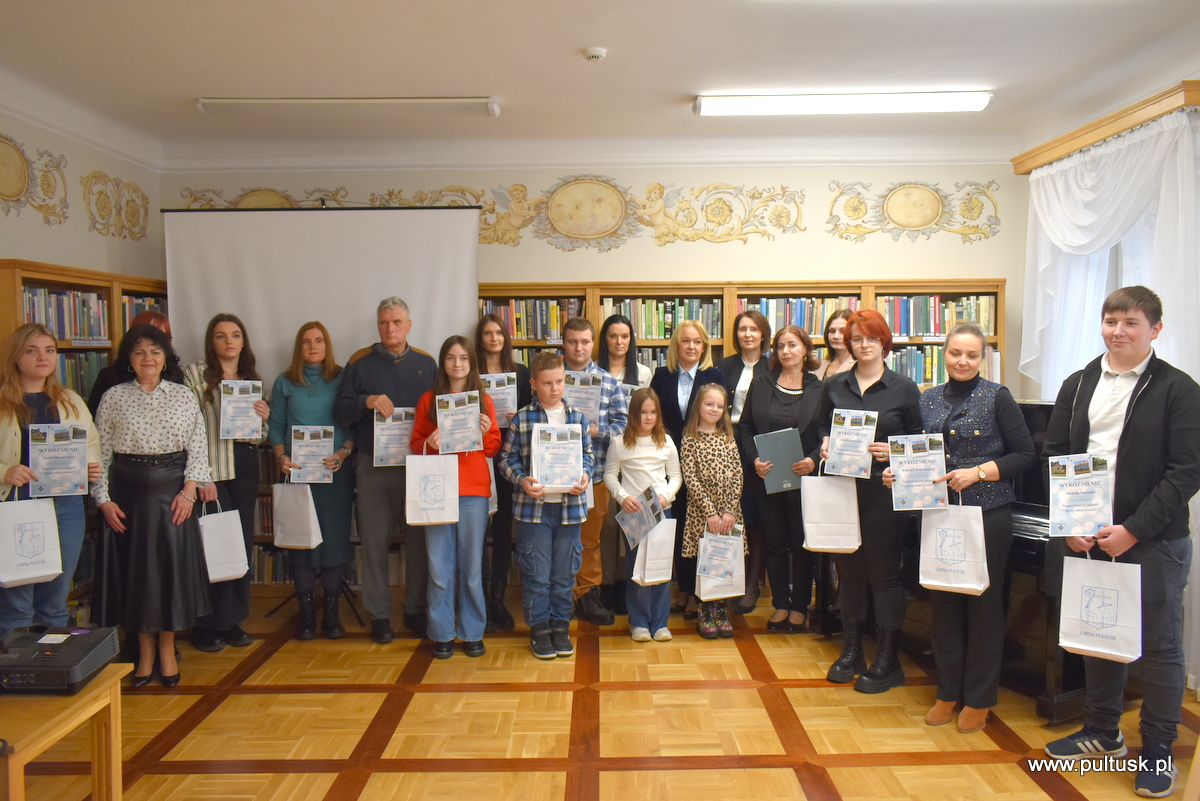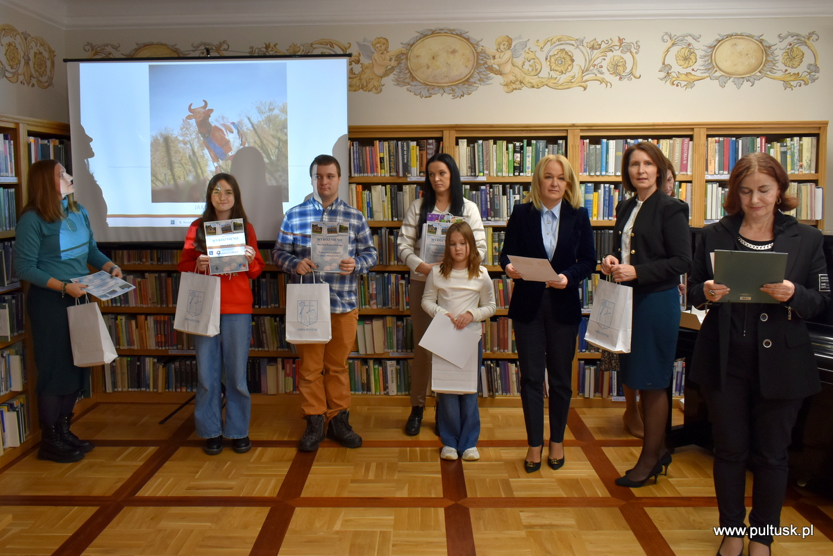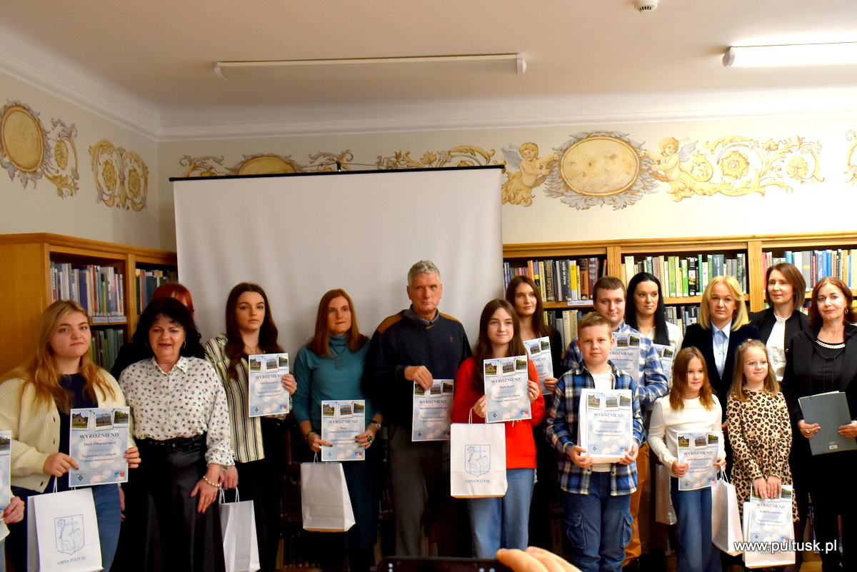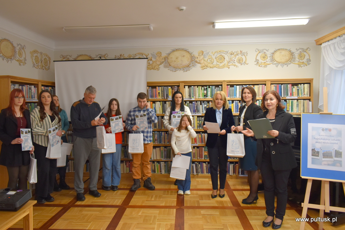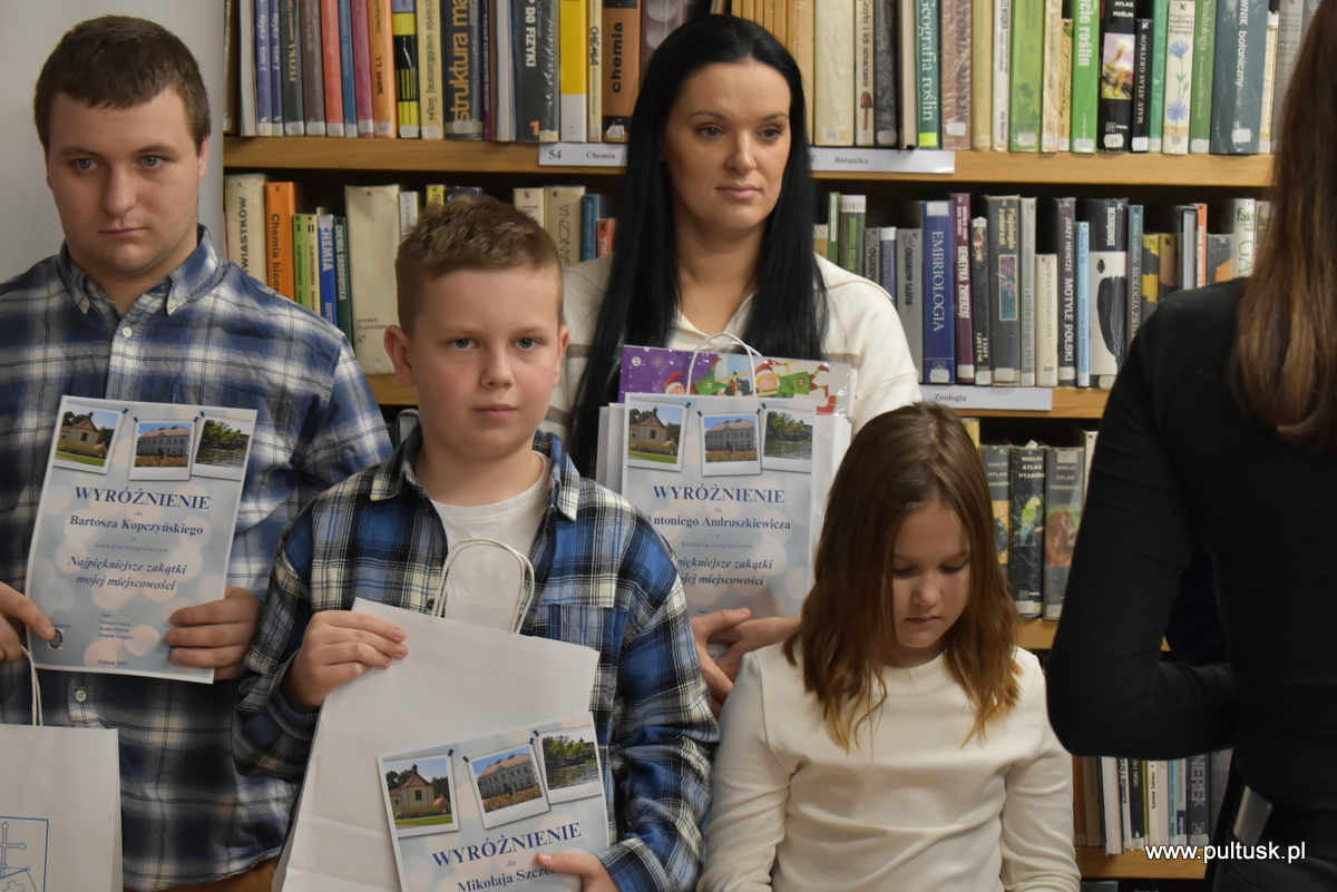 W środę, 11 grudnia 2024 r. w czytelni Pułtuskiej Biblioteki Publicznej im. Joachima Lelewela odbyło się podsumowanie konkursu fotograficznego ,,Najpiękniejsze zakątki mojej miejscowości” pod patronatem Starosty Pułtuskiego i Burmistrza Miasta Pułtusk. Konkurs miał charakter otwarty i skierowany był do wszystkich mieszkańców powiatu pułtuskiego. Komisja konkursowa w składzie: Grzegorz Gerek – przewodniczący, Bożena Potyraj, Dominik Gregajtis spośród 78 prac wybrała 20 najlepszych, które zostaną opublikowane na facebooku biblioteki. Przyznano 4 miejsca główne i 16 wyróżnień. Nagrody i dyplomy laureatom wręczyły Sekretarz Powiatu Katarzyna Jankowska i Sekretarz Miasta Pułtusk Patrycja Kazimierczak.