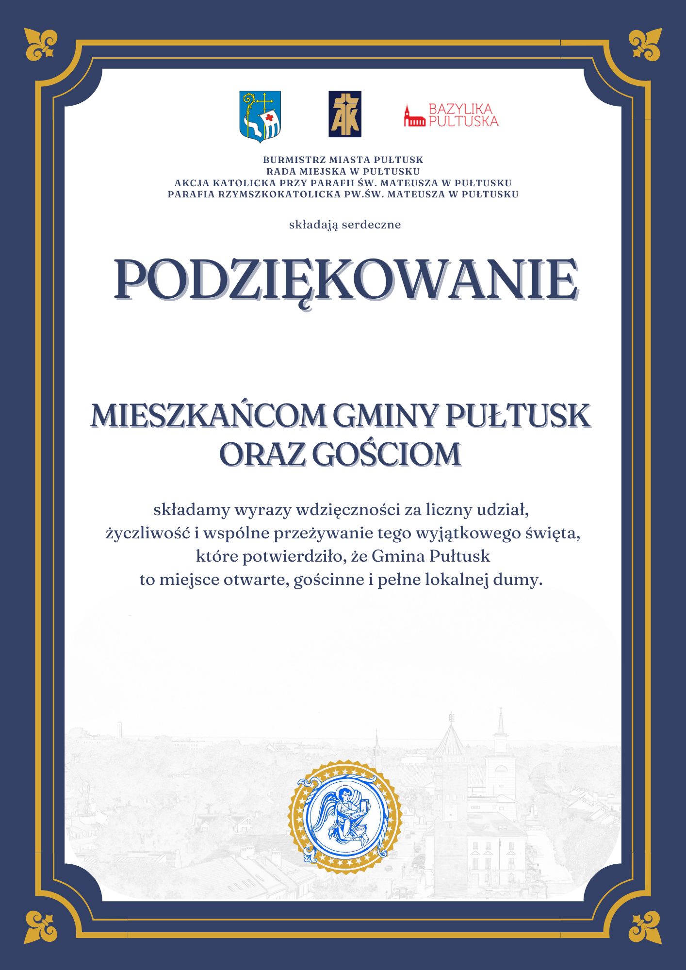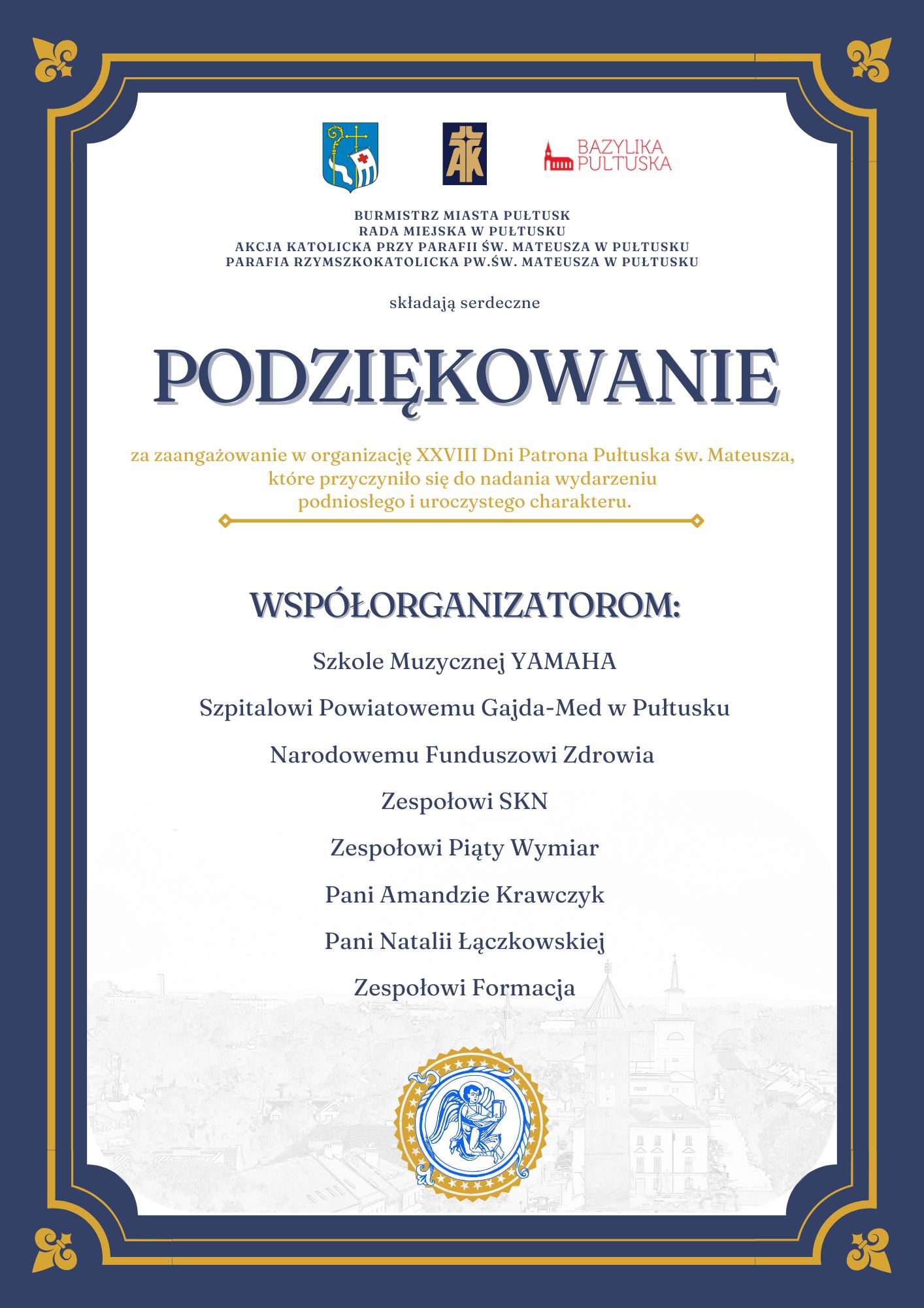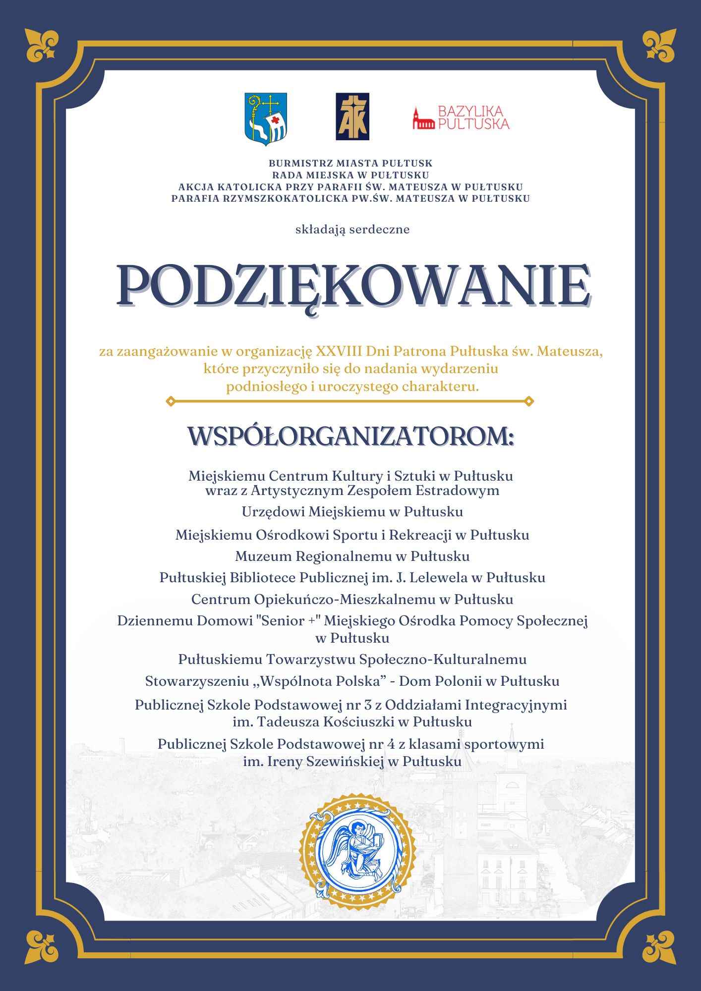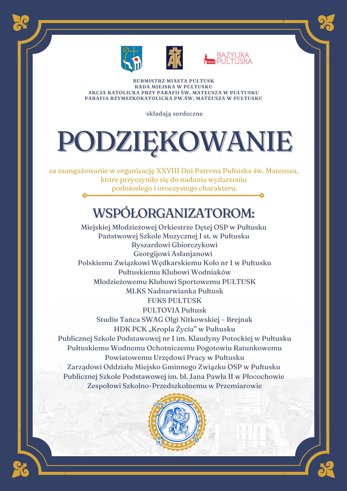 składają serdeczne PODZIĘKOWANIE za zaangażowanie w organizację XXVIII Dni Patrona Pułtuska św. Mateusza, które przyczyniło się do nadania wydarzeniu podniosłego i uroczystego charakteru.