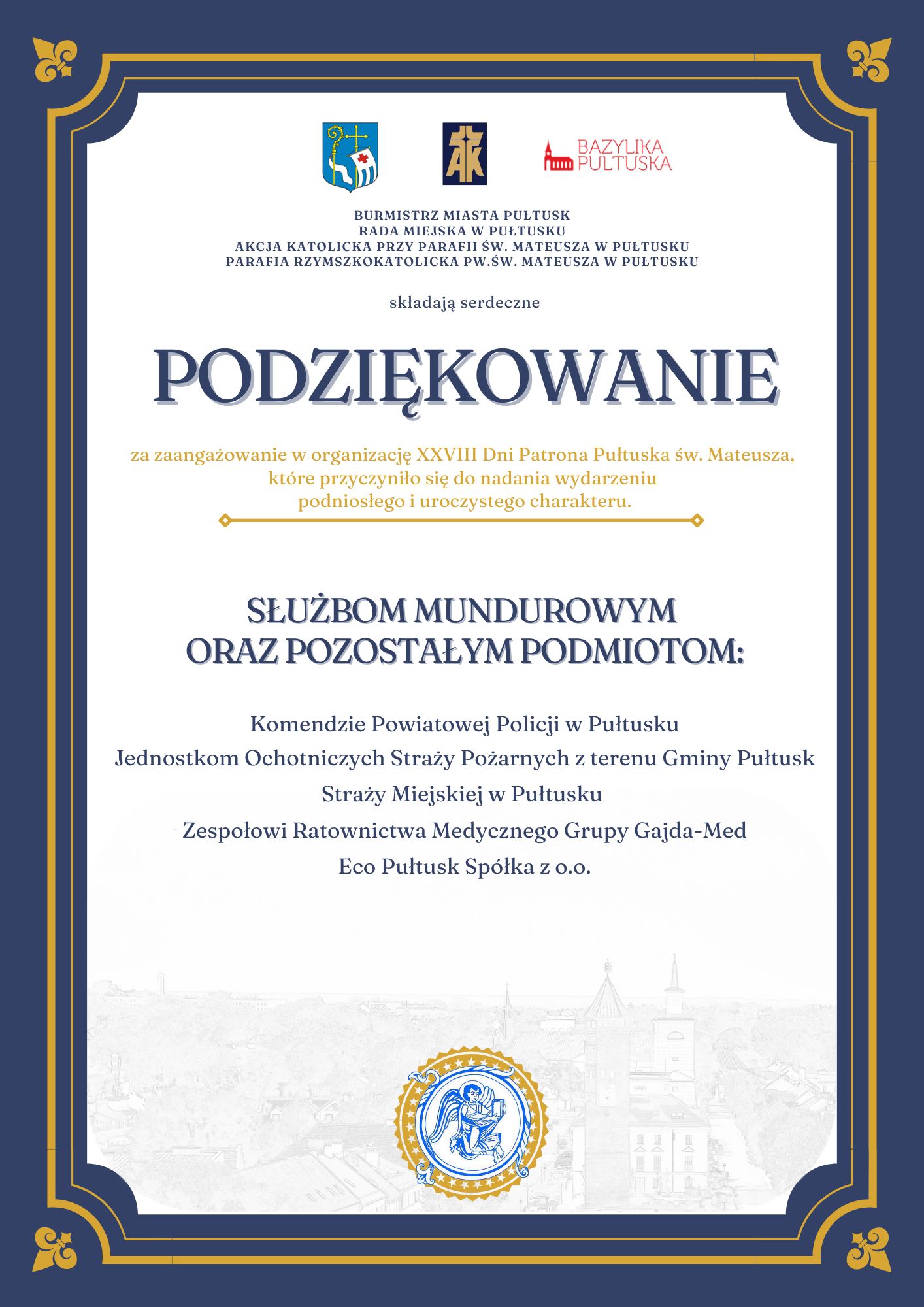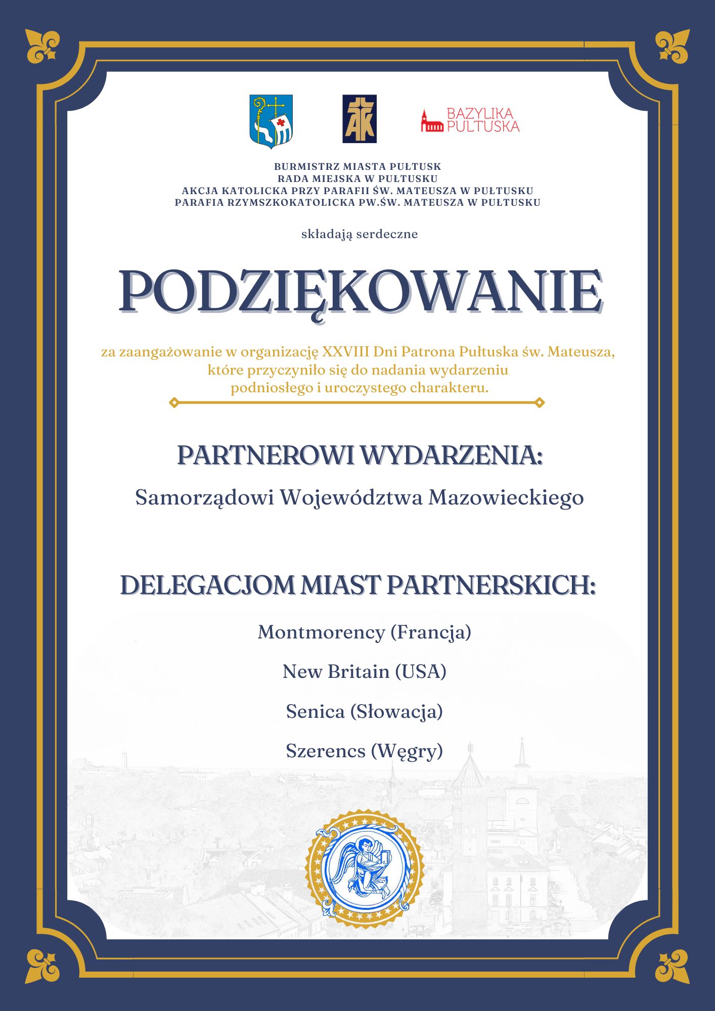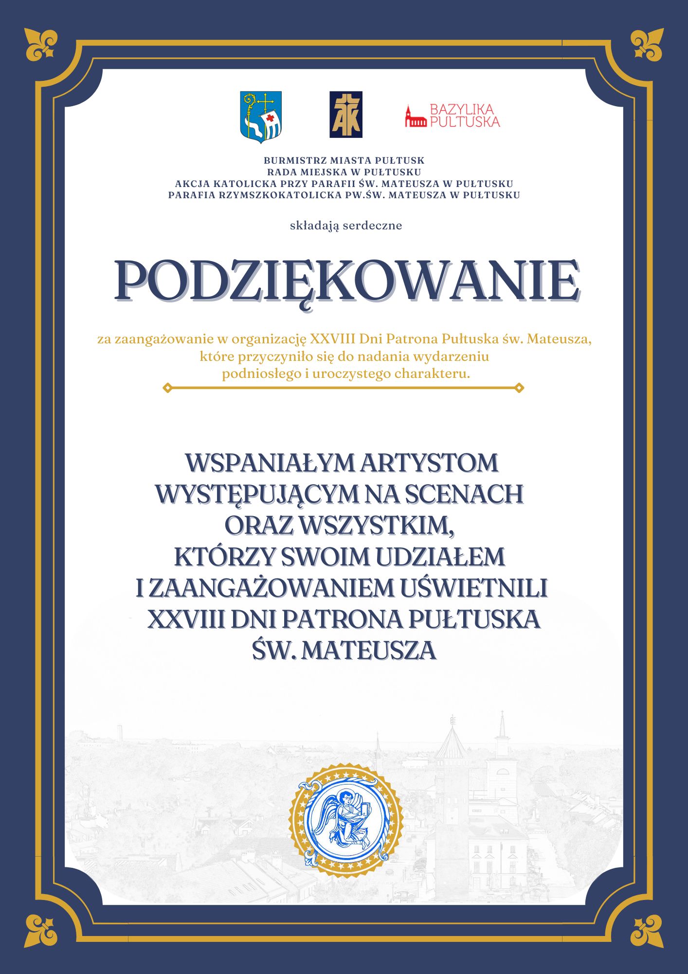 składają serdeczne PODZIĘKOWANIE za zaangażowanie w organizację XXVIII Dni Patrona Pułtuska św. Mateusza, które przyczyniło się do nadania wydarzeniu podniosłego i uroczystego charakteru.