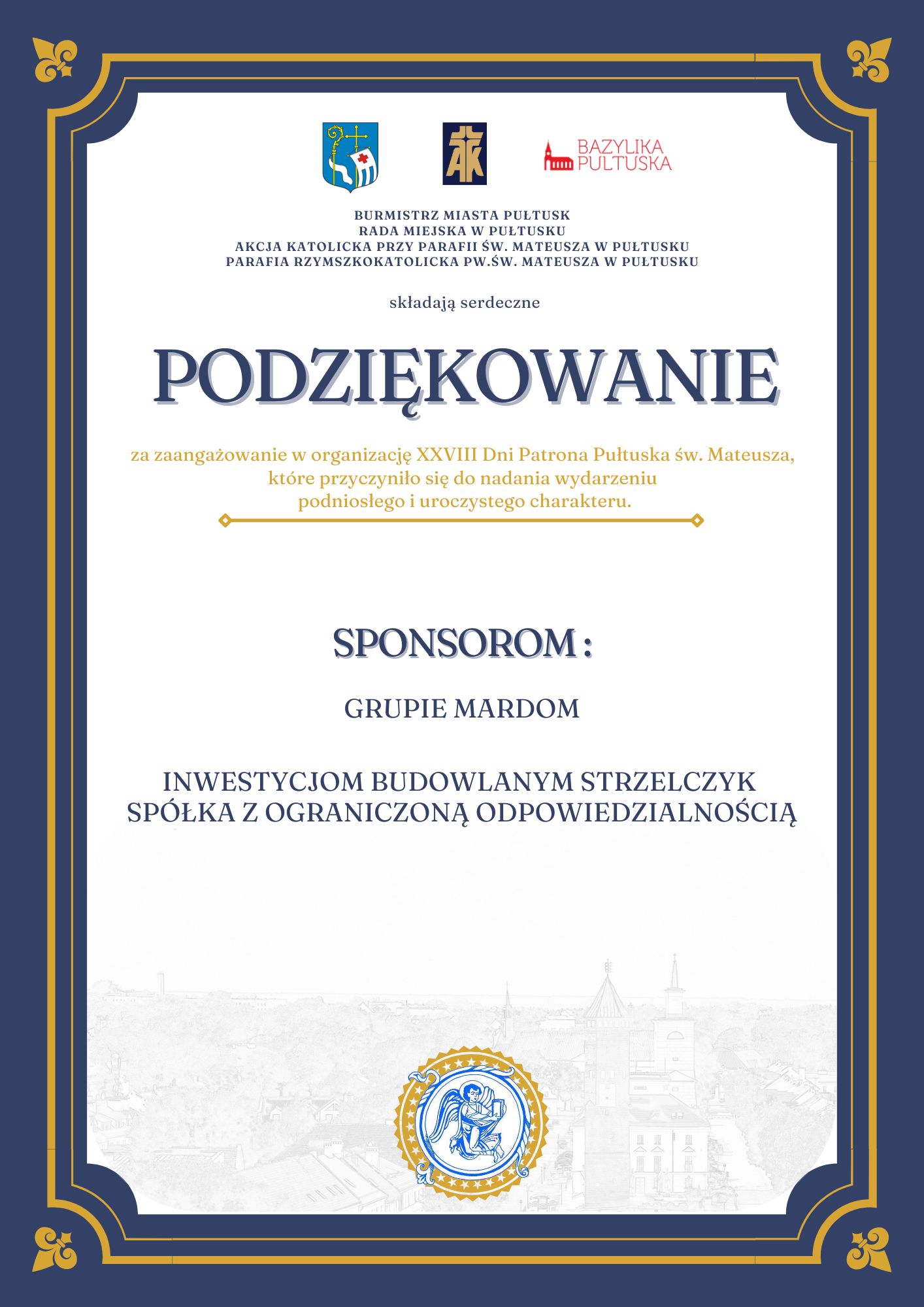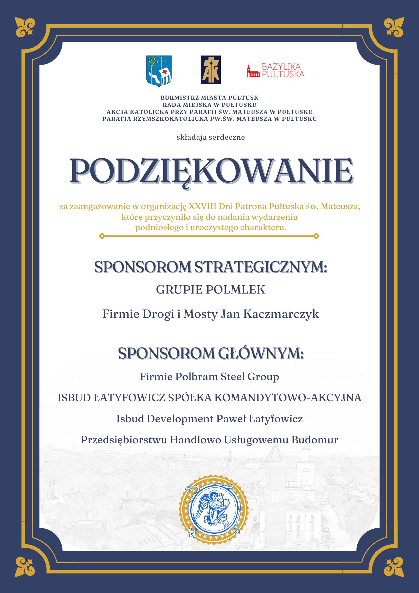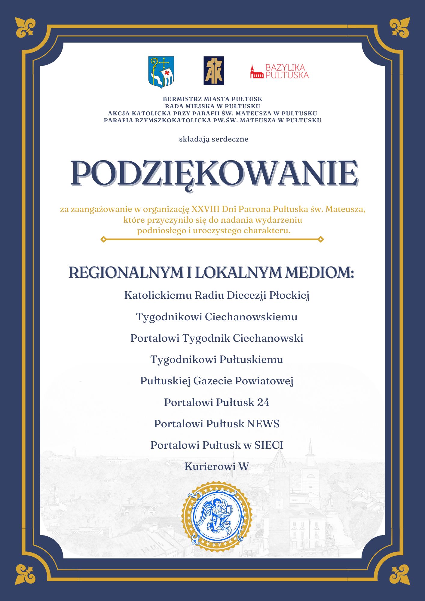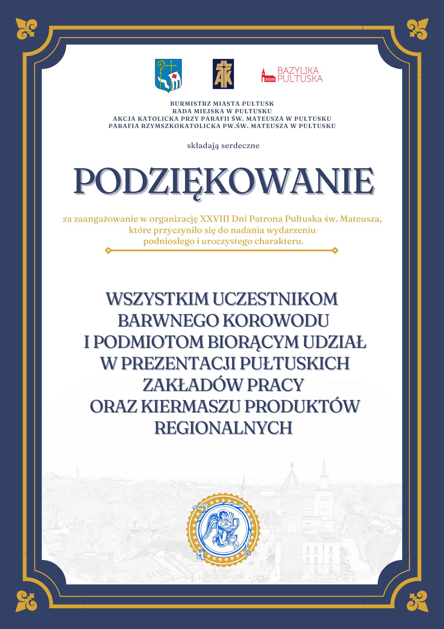 składają serdeczne PODZIĘKOWANIE za zaangażowanie w organizację XXVIII Dni Patrona Pułtuska św. Mateusza, które przyczyniło się do nadania wydarzeniu podniosłego i uroczystego charakteru.