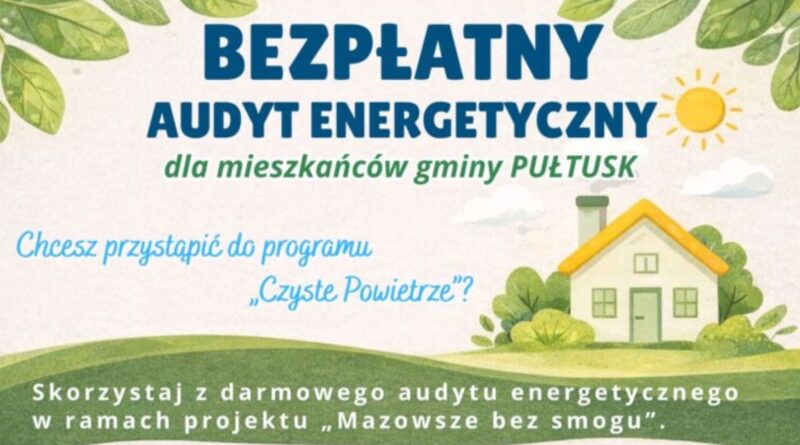 Przypominamy, że mieszkańcy Gminy Pułtusk którzy chcą przystąpić do Programu Czyste Powietrze mogą skorzystać z darmowego audytu energetycznego. Szczegóły dotyczące audytu znajdują się na plakacie poniżej.