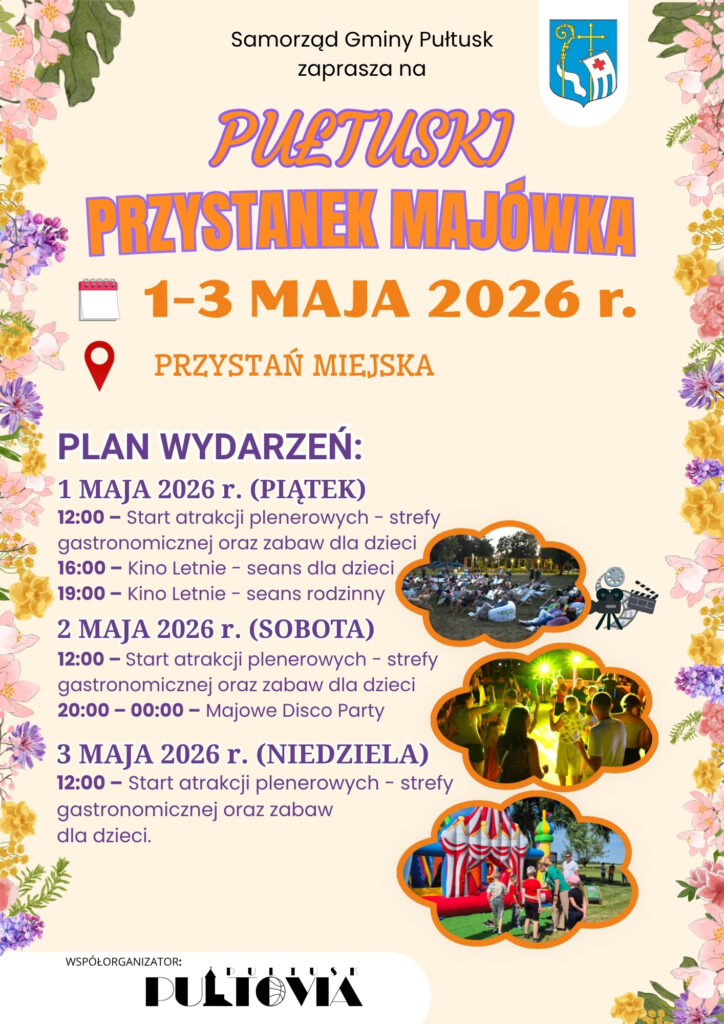 Samorząd Gminy Pułtusk serdecznie zaprasza mieszkańców oraz gości do wspólnego świętowania podczas wydarzenia „Pułtuski Przystanek Majówka”, które odbędzie się w dniach 1–3 maja 2026 r. na Przystani Miejskiej. To trzy dni pełne atrakcji dla całych rodzin, łączące rekreację, kulturę i dobrą zabawę w plenerze.