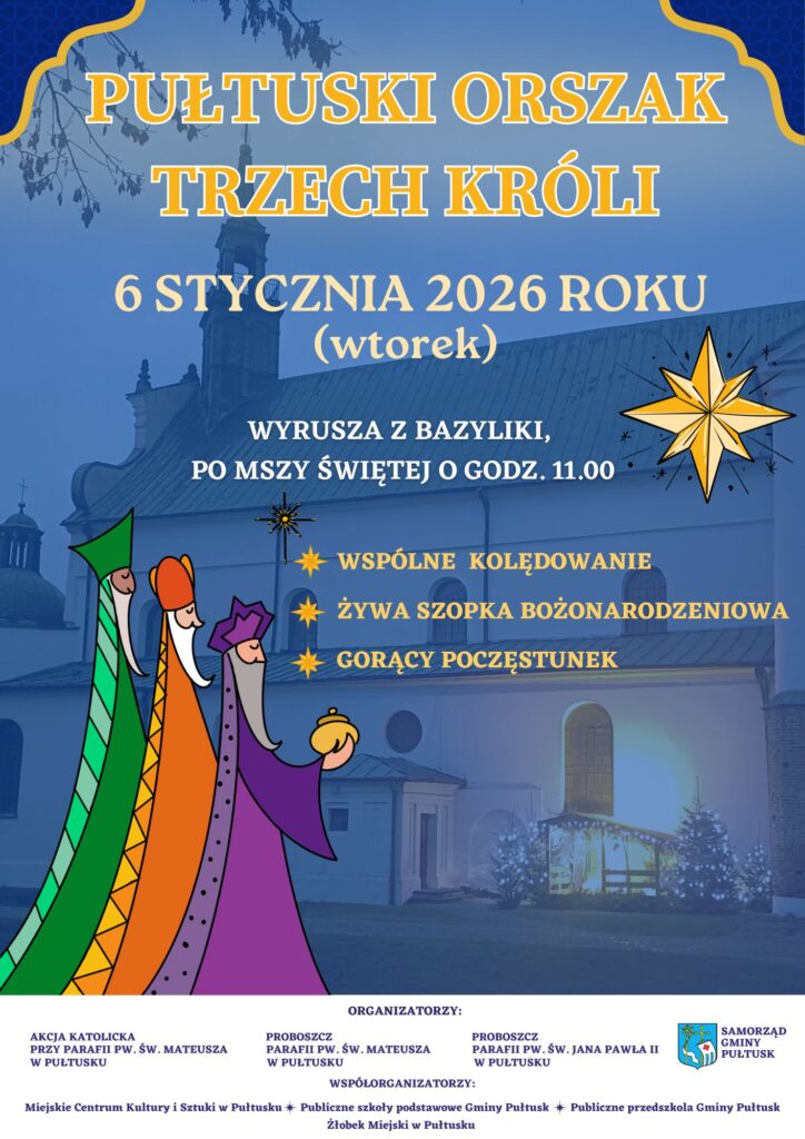 Serdecznie zapraszamy do udziału w Pułtuskim Orszaku Trzech Króli, który odbędzie się 6 stycznia 2026 roku (wtorek).