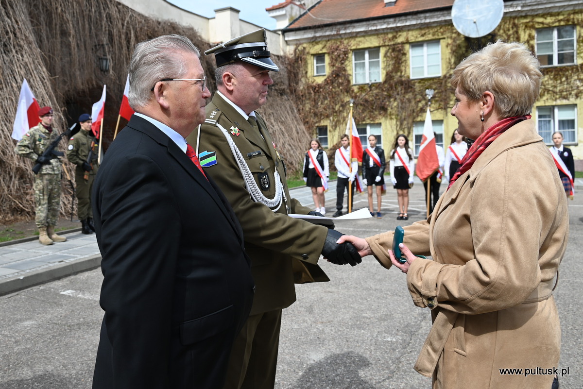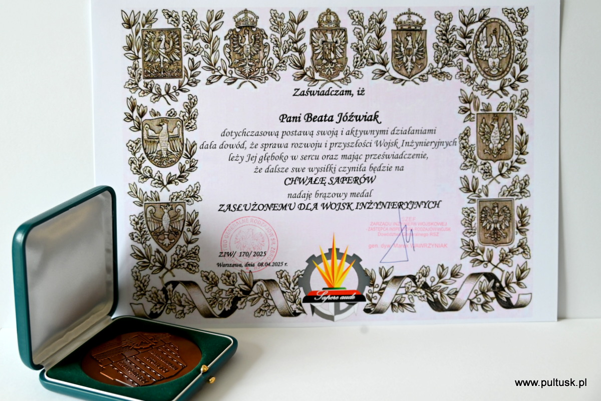 Następnie głos zabrał generał brygady Wojska Polskiego w stanie spoczynku doktor Bogusław Bębenek – Prezes Koła nr 24 Stowarzyszenia Saperów Polskich im. 1 Batalionu Saperów w Pułtusku, który m.in. podziękował przedstawicielom samorządów za wspieranie działań podejmowanych przez Stowarzyszenie i troskę o zachowanie pamięci o bohaterskich czynach saperów i ich nieocenionym wkładzie w życie lokalnej społeczności. Pułkownik Artur Talik odczytał Decyzję Szefa Zarządu Inżynierii Wojskowej Dowództwa Generalnego Rodzajów Sił Zbrojnych generała dywizji Marka Wawrzyniaka w sprawie wyróżnienia medalami pamiątkowymi Wojsk Inżynieryjnych z okazji Święta Wojsk Inżynieryjnych, a następnie wraz z generałem Bogusławem Bębenkiem wręczyli Burmistrz Miasta Pułtusk Beacie Jóźwiak – Brązowy Medal „ZASŁUŻONEMU DLA WOJSK INŻYNIERYJNYCH”.