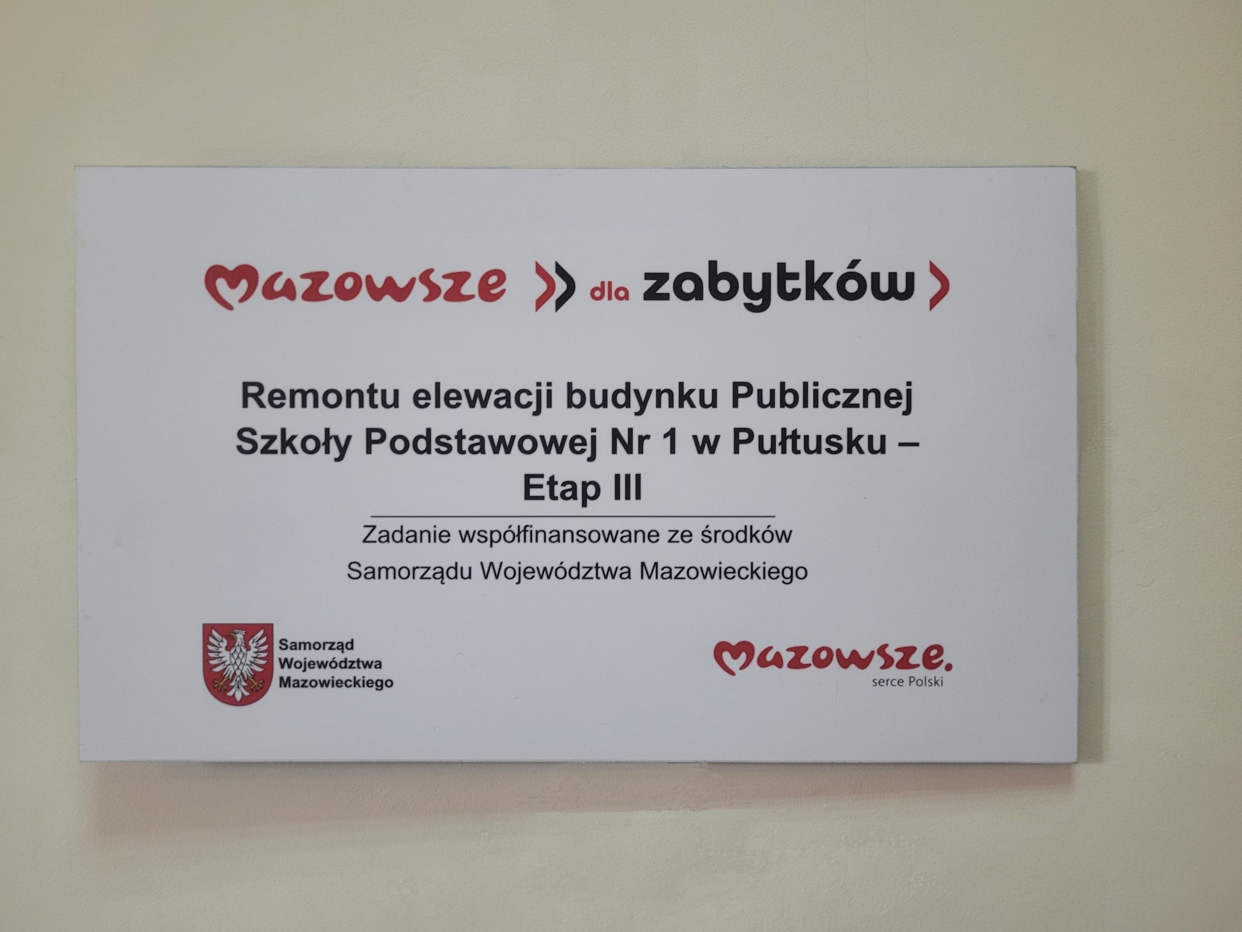 W roku bieżącym dzięki dofinansowaniu kwotą w wysokości 200 000,00 zł otrzymanemu z Urzędu Marszałkowskiego Województwa Mazowieckiego w Warszawie w ramach programu „Mazowsze dla zabytków 2024” oraz środkom własnym, został zakończony kolejny, już ostatni, etap prac pod nazwą „Remont elewacji budynku Publicznej Szkoły Podstawowej Nr 1 w Pułtusku – Etap III”.