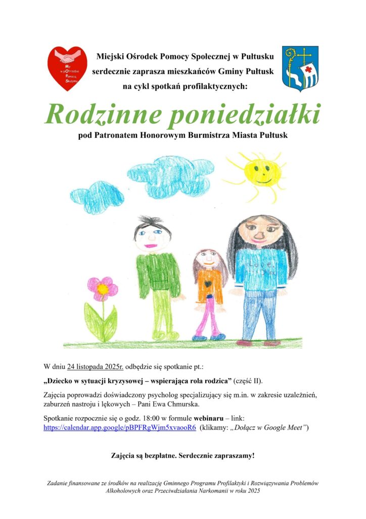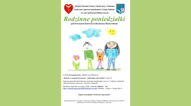 Miejski Ośrodek Pomocy Społecznej w Pułtusku zaprasza w dniu 24 listopada 2025r. na kolejne spotkanie w ramach rozpoczętego już cyklu „Rodzinnych poniedziałków” realizowanych pod Patronatem Honorowym Burmistrza Miasta Pułtusk