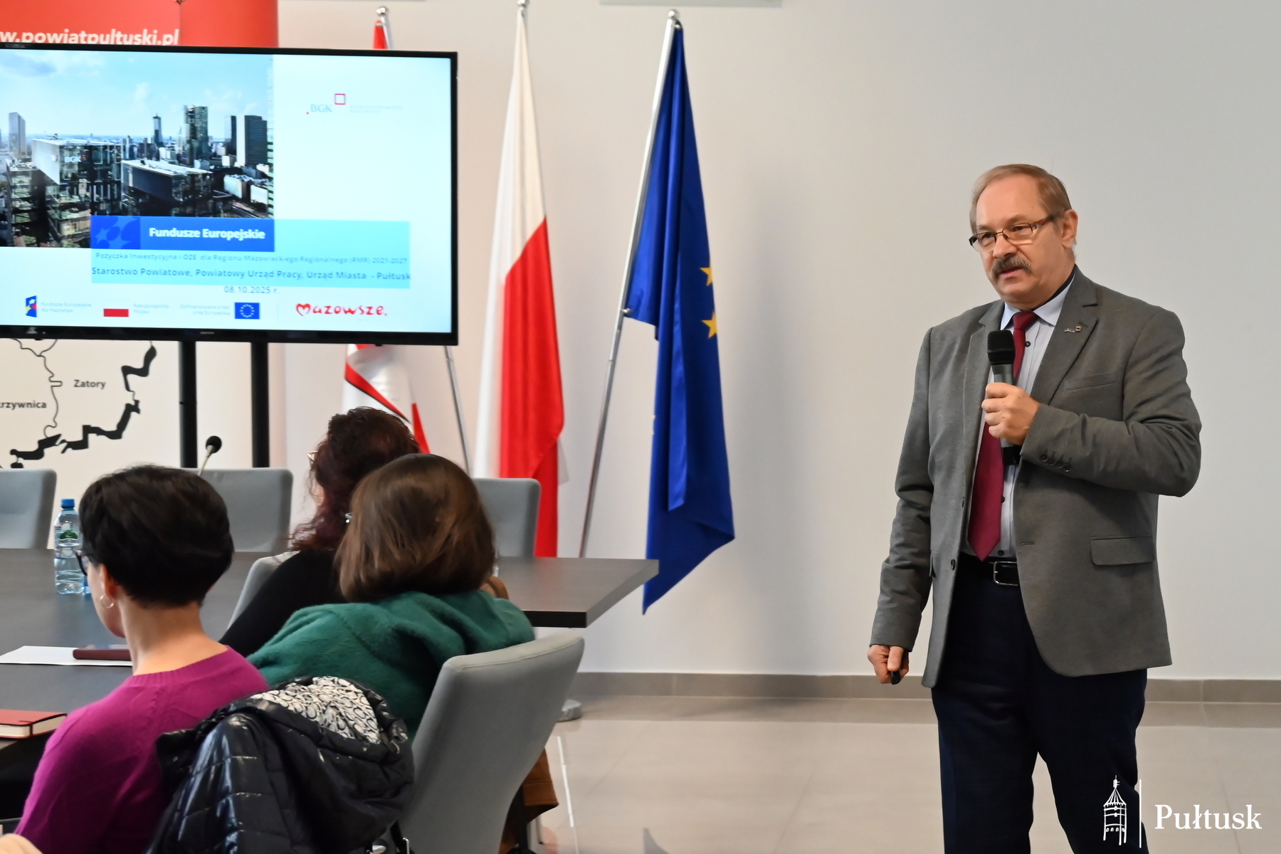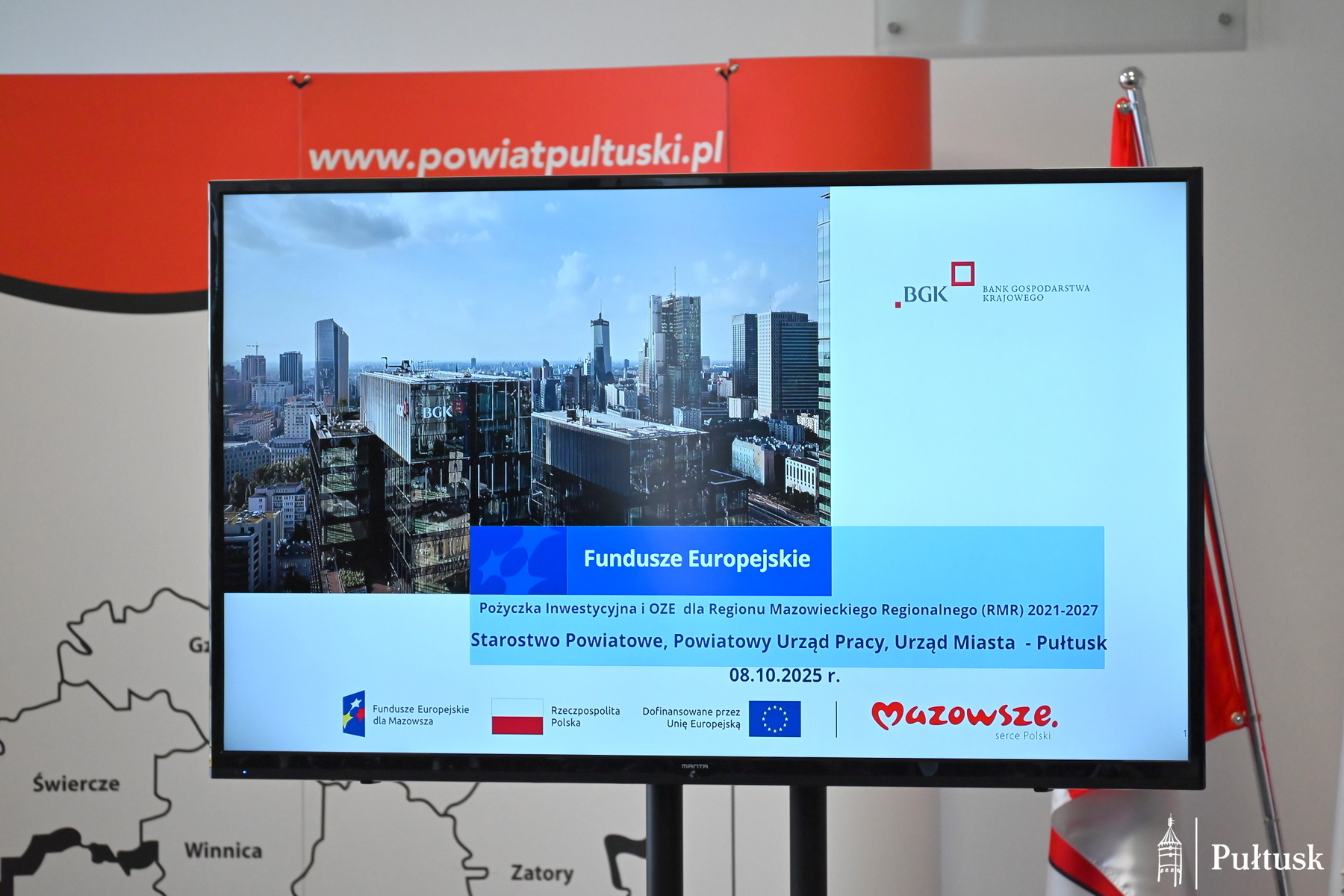 W siedzibie Starostwa Powiatowego w Pułtusku, w środę 8 października br. odbyło się spotkanie informacyjno-szkoleniowe „Pożyczka Inwestycyjna oraz OZE dla Regionu Mazowieckiego Regionalnego”. Organizatorem wydarzenia był Bank Gospodarstwa Krajowego, a jego współorganizatorami: Starosta Pułtuski Jan Zalewski, Burmistrz Miasta Pułtusk Beata Jóźwiak oraz Dyrektor Powiatowego Urzędu Pracy w Pułtusku Witold Chrzanowski. W spotkaniu udział wzięli m.in.: lokalni przedsiębiorcy oraz przedstawiciele Jednostek Samorządu Terytorialnego.
